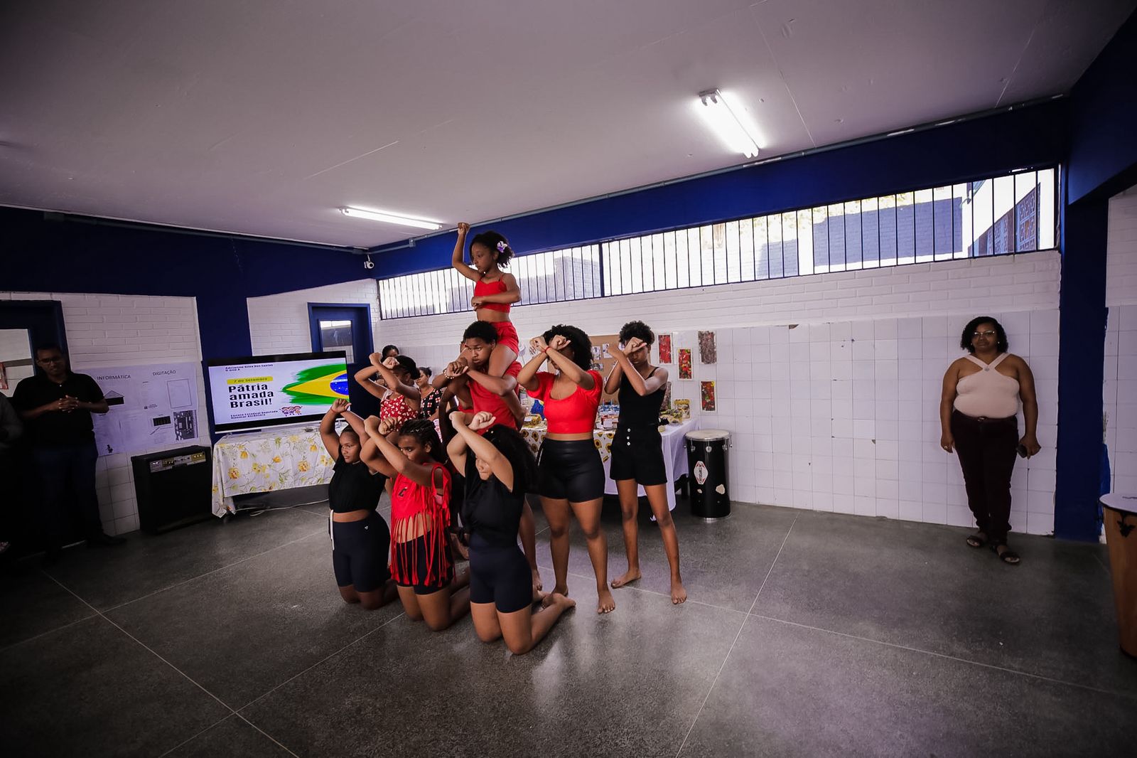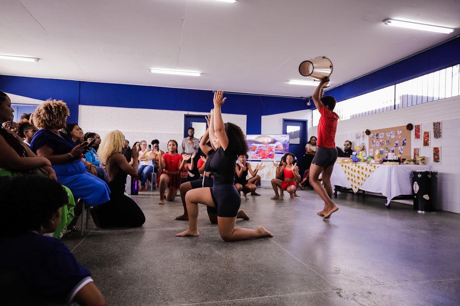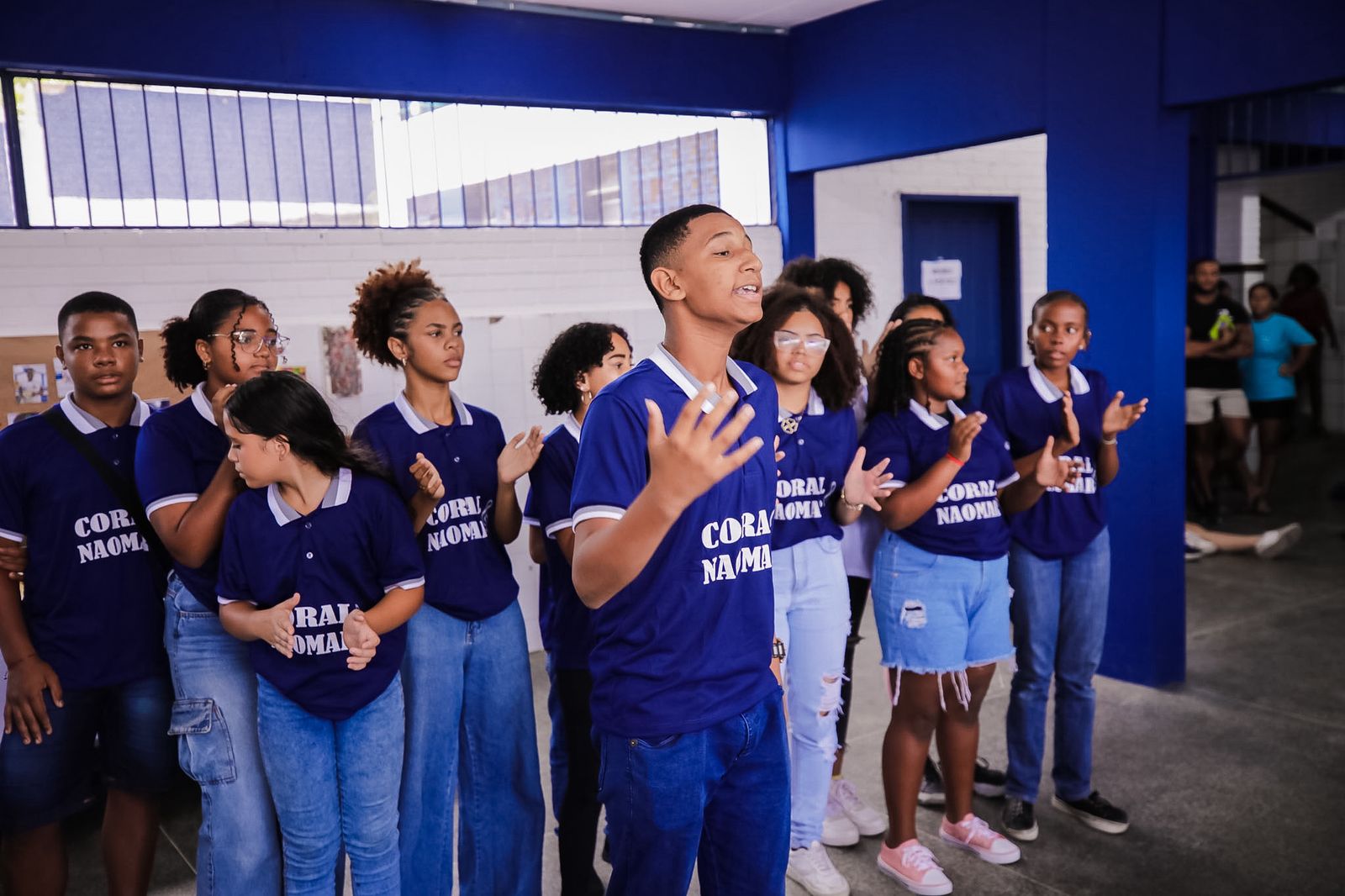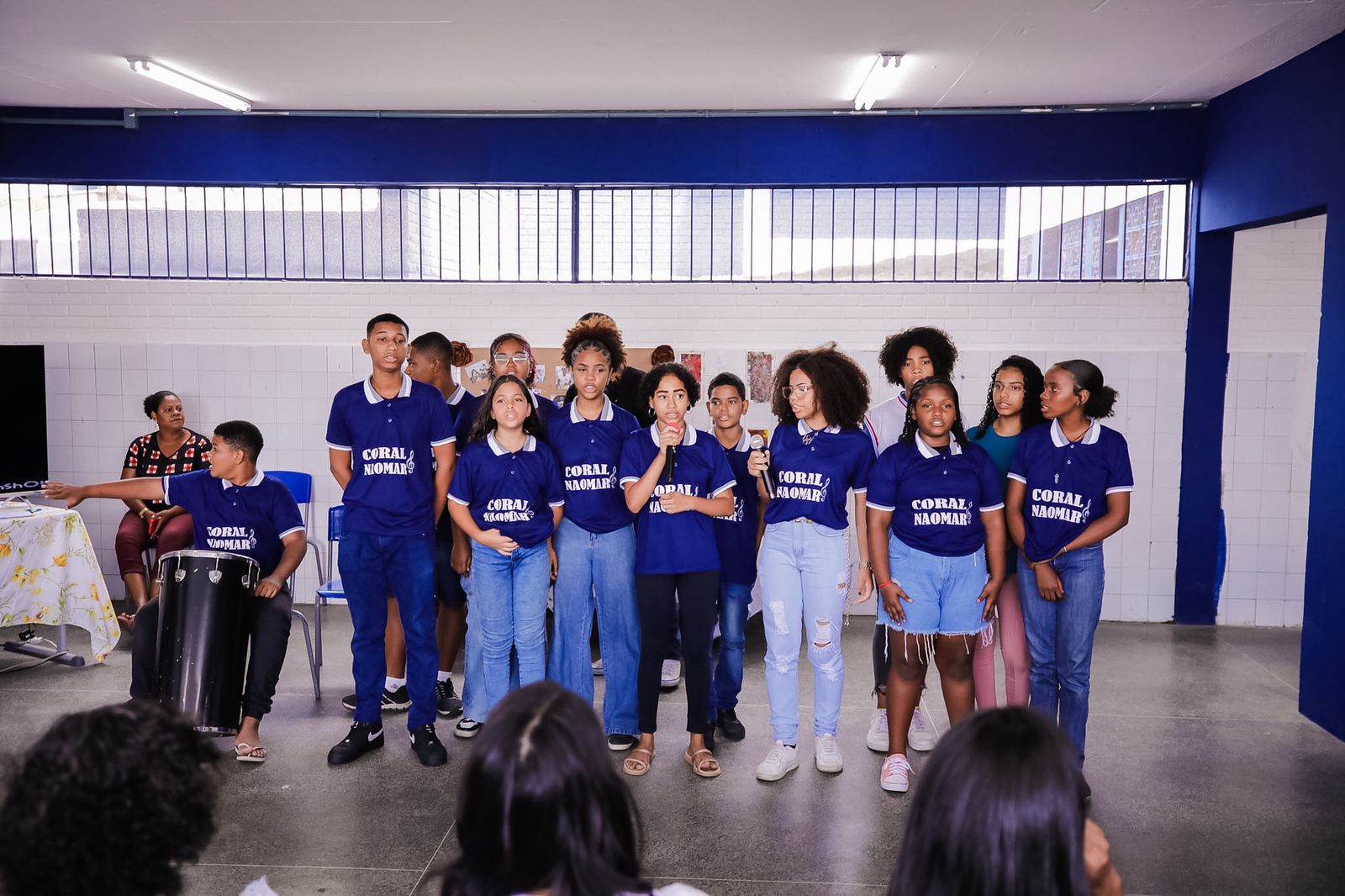 Na Escola Estadual Naomar Alcântara, em Cajazeiras V, os estudantes realizaram apresentações artísticas e exposições desenvolvidas dentro das oficinas do Educa Mais Bahia.