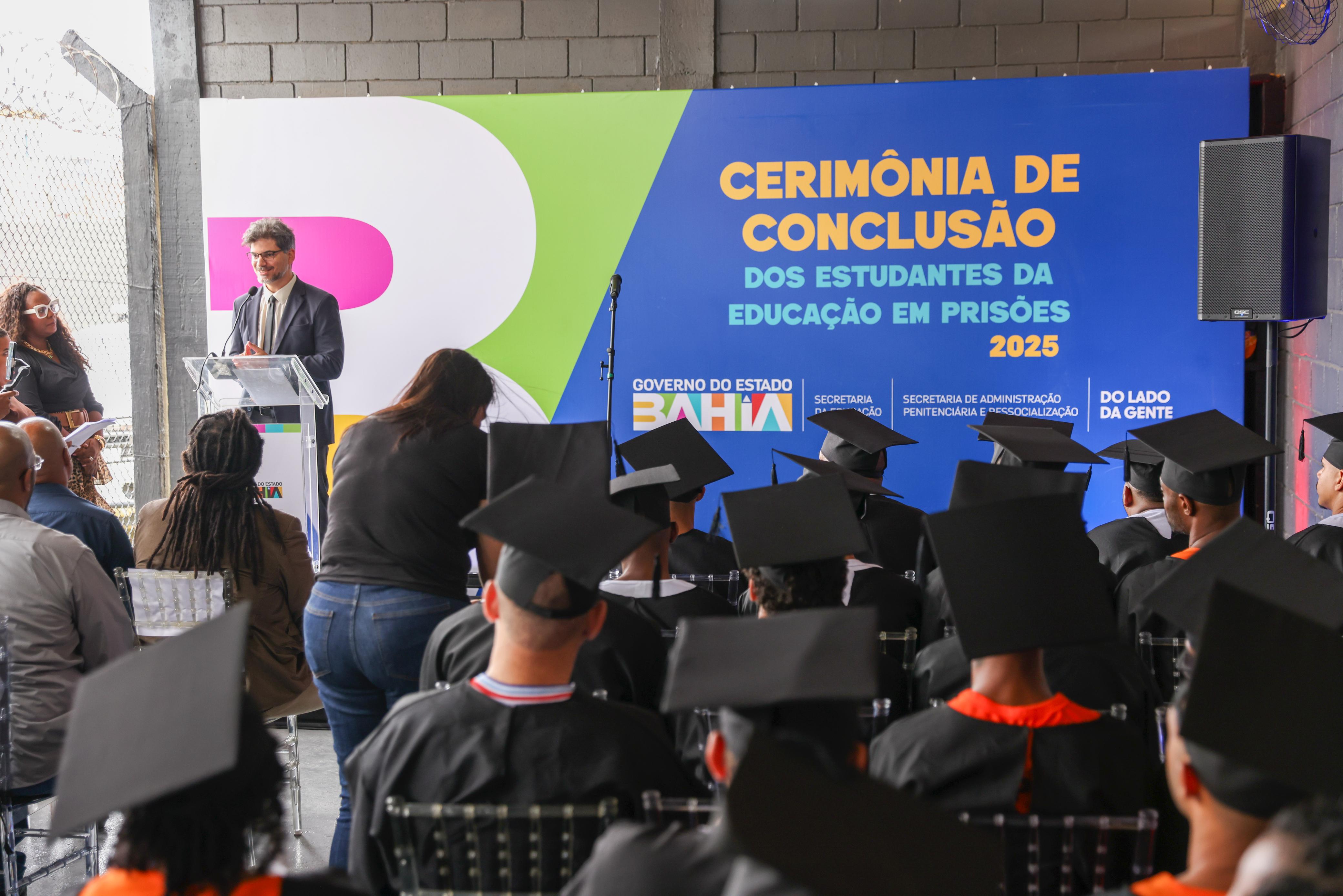A manhã desta segunda-feira (15) foi marcada por emoção e novos começos no Conjunto Penal Masculino de Salvador, em Mata Escura, onde a Secretaria da Educação do Estado da Bahia (SEC) realizou a Cerimônia de Conclusão dos Estudantes da Educação Prisional. Ao todo, 32 estudantes da Educação de Jovens e Adultos (EJA) concluíram a Educação Básica em um momento simbólico que reuniu familiares e reafirmou a educação como caminho concreto de reconstrução de histórias e ampliação de possibilidades, mesmo em contextos de privação de liberdade.