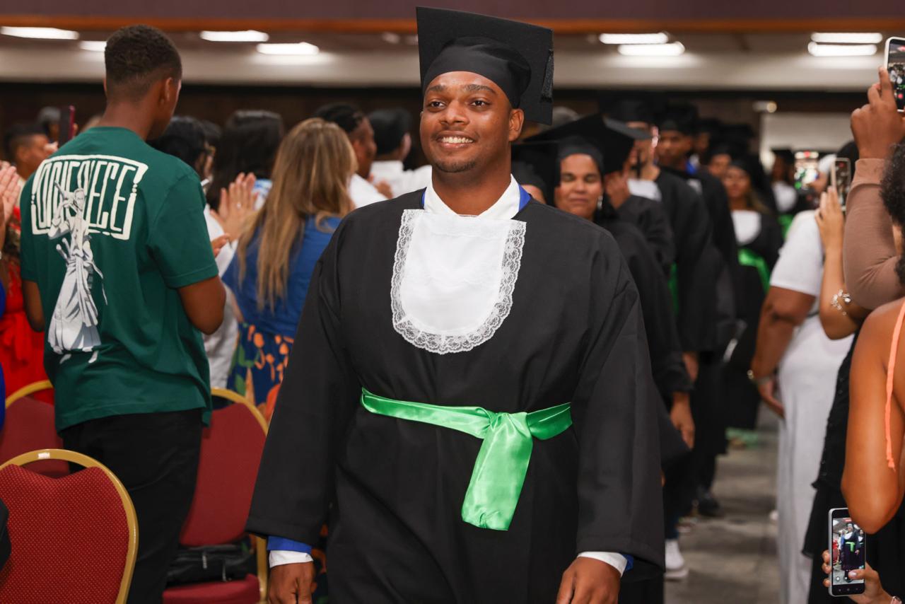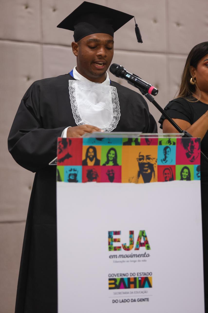A Secretaria da Educação do Estado da Bahia (SEC) realizou, nesta terça-feira (16), no Fiesta Bahia Hotel, em Salvador, a formatura de 293 estudantes concluintes da Educação de Jovens e Adultos. As demais escolas da capital, da Região Metropolitana de Salvador e do interior, que somam 44.702 concluintes da EJA, realizarão as suas cerimônias juntamente com as formaturas do Ensino Médio, no dia 19 de dezembro. A solenidade histórica, que aconteceu pela primeira vez na Bahia, contou com a participação de convidados e familiares, marcando a finalização de um ciclo e o início de novas possibilidades de futuro.