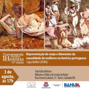 Na próxima segunda-feira (3), o Curso Conversando com Sua História, do Centro de Memória da Bahia - unidade vinculada à Fundação Pedro Calmon/ Secretaria de Cultura do Estado da Bahia - chegará à sua 14ª edição com o tema “Representação do corpo e dimensões da sexualidade de mulheres na América portuguesa”. A palestra será dada pela doutora em História pela Universidade de Essex, Reino Unido, Lígia Bellini, às 17h, na Biblioteca Estadual (Barris).