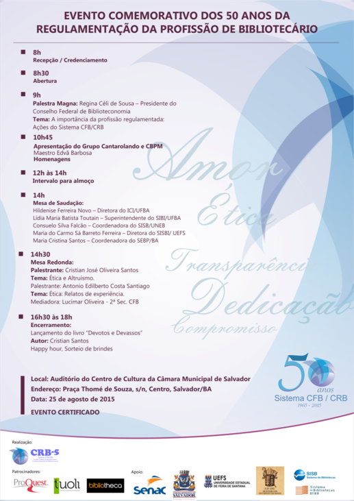 Jubileu – Os 50 anos da profissão - Jubileu de Ouro - serão celebrados por bibliotecários de todo o estado no próximo dia 25 de agosto, em Salvador, com um grande encontro no Centro Cultural da Câmara (Praça Thomé de Souza), a partir das 8h. O evento contará com a participação da coordenadora do Sistema Estadual de Bibliotecas Públicas, Maria Cristina Santos e de especialistas na área de Biblioteconomia, além de lançamento de livro. Veja programação abaixo.