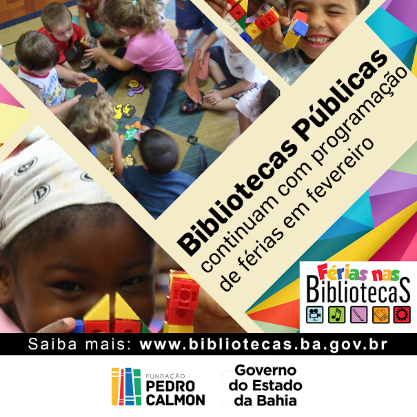 Com o intuito de provocar e fomentar o interesse pelo livro, leitura e literatura, a Diretoria de Bibliotecas Públicas (DIBIP) – unidade vinculada à Fundação Pedro Calmon/Secretaria de Cultura do Estado da Bahia – realizará durante os meses de janeiro e fevereiro, o projeto “Férias nas Bibliotecas 2016: exercitando leituras e brincadeiras”. A ação pretende desenvolver aproximadamente 150 atividades em diferentes linguagens nas bibliotecas públicas estaduais, entre narração de histórias, peças teatrais, oficinas, ateliês de pintura infantil, bate-papos, palestras, filmes e cursos. Todas as atividades são abertas ao público.