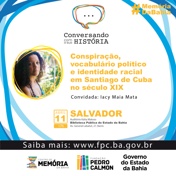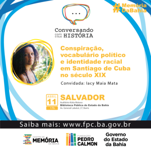 O próximo Conversando com a sua História, realizado pelo Centro de Memória da Bahia – unidade da Fundação Pedro Calmon – terá como tema “Conspiração, vocabulário político e identidade racial em Santiago de Cuba no século XIX”, com a Doutora em História Social (Unicamp) e professora de História da América da Universidade Federal da Bahia, Iacy Maia Mata. A conversa acontece na próxima segunda-feira (11), às 17h, no auditório da Biblioteca Pública do Estado da Bahia (Barris), é aberta ao público e certificada.