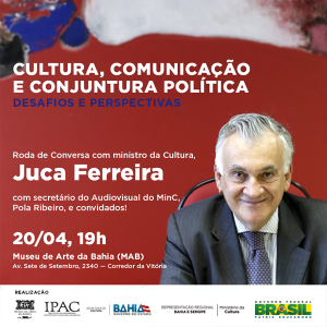 O ministro da Cultura Juca Ferreira participa da Roda de Conversa “Cultura, Comunicação e Conjuntura Política - Desafios e perspectivas”, na quarta-feira (20.04), às 19h, no Museu de Arte da Bahia (MAB), em Salvador. O encontro é organizado pela Representação Regional do MinC – Bahia e Sergipe.