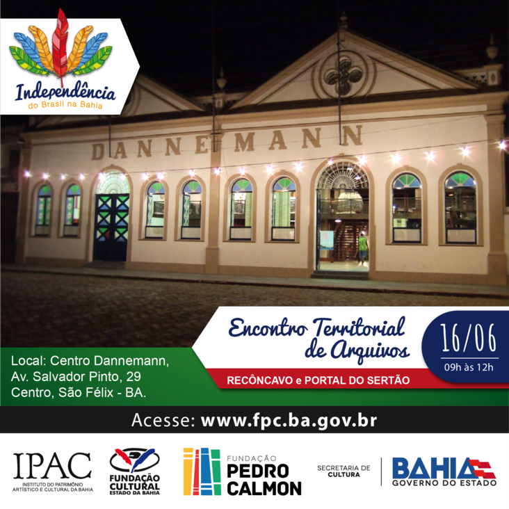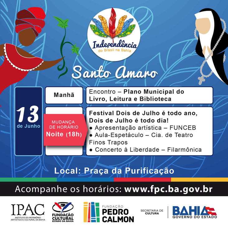 #Rota da Independência - Realizada pela Fundação Pedro Calmon/SecultBA, a Rota visa reforçar na memória dos municípios que participaram das lutas pela Independência do Brasil na Bahia, seus respectivos papéis no processo, fortalecendo o senso cívico e cultural dos mesmos. Com o tema 2 de Julho é todo ano, 2 de Julho é todo dia, a Rota 2016 conta com a parceria da Fundação Cultural da Bahia (Funceb) e do Instituto do Patrimônio Artístico Cultural da Bahia (Ipac) e revisita algumas dessas cidade, levando uma programação com música, arte e oficinas de leitura, de 13 a 30 de junho. Os municípios de Santo Amaro (13), São Francisco do Conde (14), Cachoeira (15), São Felix (16), Maragogipe (17), Itaparica (20) e Caetité (29) receberão a Rota da Independência, que este ano, celebra nove anos. Todas as informações e atividades estão disponíveis no site www.fpc.ba.gov.br.