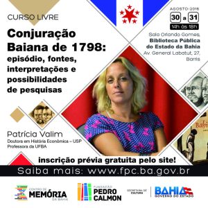 O Curso é uma realização do Centro de Memória da Bahia (CMB), vinculado à Fundação e abordará a história e a historiografia da Conjuração Baiana, também conhecida como a Revolta dos Alfaiates ou Revolta dos Búzios. Na ocasião, Valim apresentará ao público os agentes e as demandas do movimento, bem como as acusações, defesas e punições. O público debaterá as possibilidades de interpretação das fontes sobre a Revolta e suas releituras do século XIX até os dias atuais. O movimento defendia a independência do país da coroa portuguesa, o fim da escravidão, um governo republicano, democrático e com liberdades plenas, o livre comércio e abertura dos portos, como principais pontos. Teve início em 12 de agosto de 1798 com a fixação, em praça pública, dos chamados boletins sediciosos e, após denúncia, os líderes foram presos e interrogados. Em 8 de novembro de 1799 foram condenados, enforcados e tiveram suas cabeças expostas em praça pública, hoje conhecida como a Praça da Piedade.