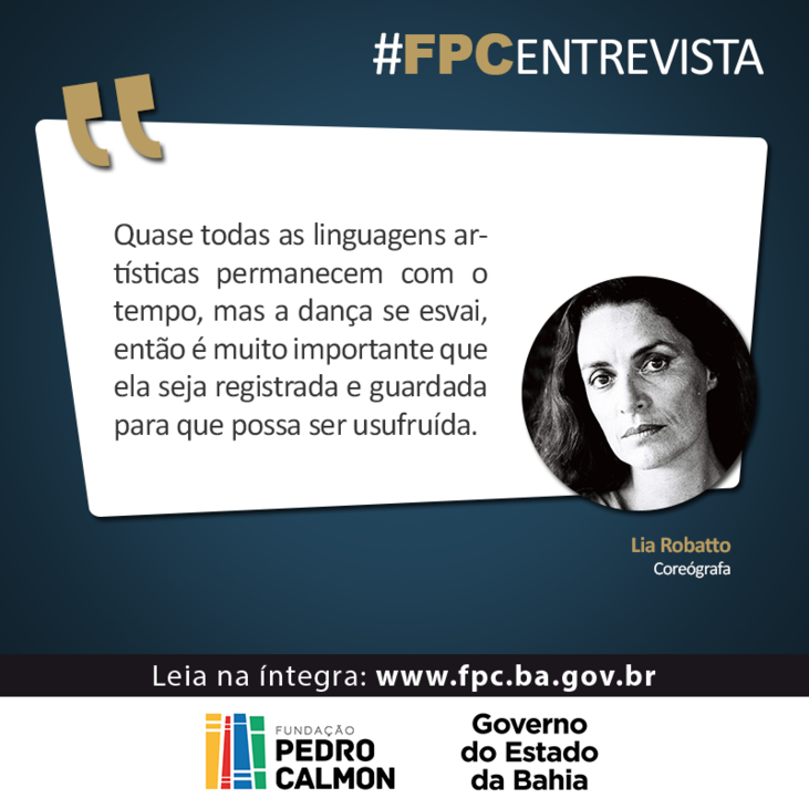 Lia Robatto - Minha vida é toda direcionada para a Dança, foi uma opção que fiz desde criança e permaneci nela, mudando evidentemente as funções e atividades conforme cada etapa da minha vinda. Mas nunca deixei esse vínculo forte com essa manifestação específica.