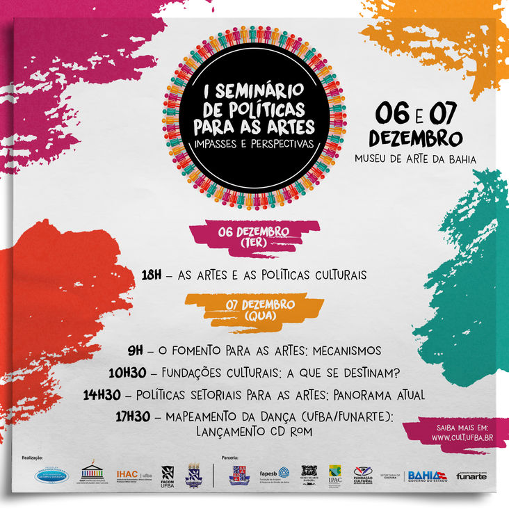 O Museu de Arte da Bahia sediará nos dias 6 e 7 de dezembro no seu auditório o “I Seminário de Políticas para as Artes: impasse e perspectivas” com a participação de gestores e ex-gestores da área da cultura, artistas, produtores e pesquisadores e de representantes do Estado, Município, UFBA e orgãos federais de cultura. Entre os convidados estão Juca Ferreira (sociólogo e ex-ministro da Cultura do Brasil), Humberto Braga (Presidente da Funarte), Jorge Portugal (secretário de Cultura do Estado), Albino Rubim e Marcio Meirelles (ex-secretários de Cultura do Estado), Fernanda Tourinho (Funceb) e Fernando Guerreiro (Fundação Gregório de Matos).
