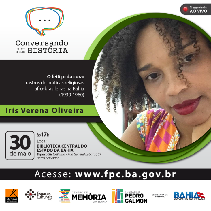 O Centro de Memória da Bahia leva a professora Iris Verena Oliveira para o Espaço Xisto, na Biblioteca Central, nos Barris, na próxima terça-feira (30). Na ocasião será apresentada mais uma edição do Conversando com Sua História, desta vez a discussão será em torno do tema “O feitiço da cura: Rastros de práticas religiosas afro-brasileiras na Bahia (1930-1960)”. O encontro é aberto ao público e tem início às 17h.