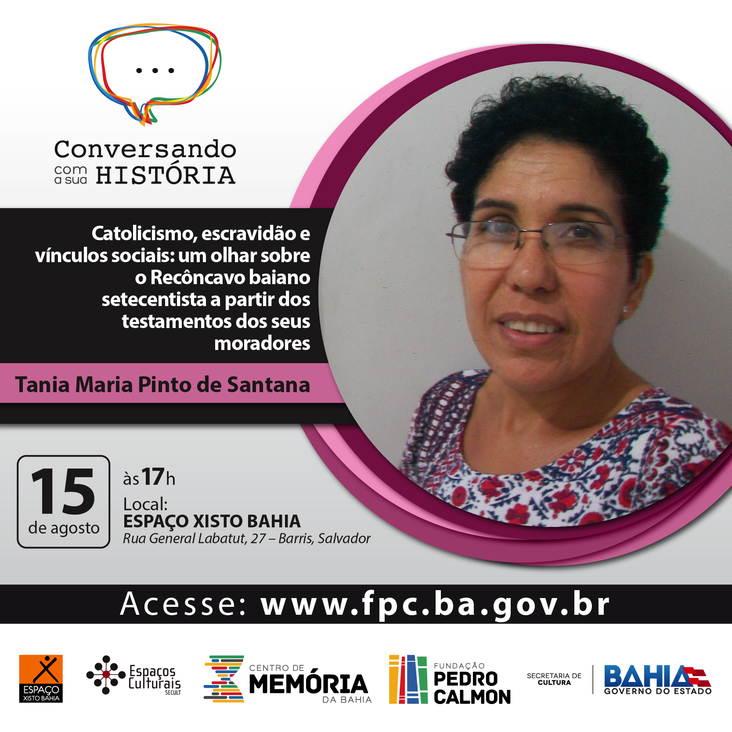 A doutora em História pela Universidade Federal da Bahia e professora da Universidade Federal do Recôncavo da Bahia, Tania Maria Pinto de Santana, será a mediadora da palestra, que é de iniciativa do Centro de Memória da Bahia. Sua principal fonte de estudos foram os testamentos, nos quais analisou os legados e esmolas deixados pelos testadores para diferentes sujeitos e instituições.