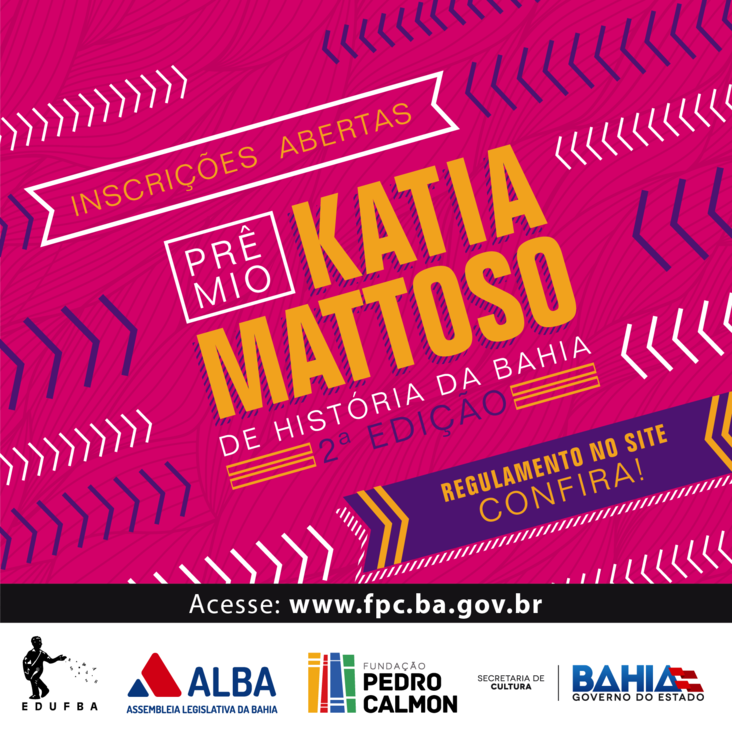 A segunda edição do Prêmio Kátia Mattoso de História da Bahia está com inscrições gratuitas e abertas até o dia 11 de outubro. O Prêmio Kátia Mattoso de História da Bahia tem como objetivo publicar em livro, uma dissertação de Mestrado e uma tese de Doutorado sobre História da Bahia. O Prêmio é destinado a dissertações ou teses escritas em Língua Portuguesa, defendidas, aprovadas e depositadas no período de dois anos até a data final das inscrições - o outubro de 2017. O Prêmio é coordenado pela Diretoria do livro e Leitura (DLL) da Fundação.