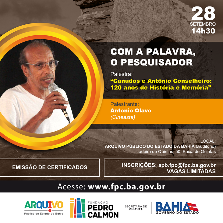 Neste ano de 2017 comemora-se 120 anos do fim de um dos maiores confrontos realizados no Brasil, a Guerra de Canudos, que mobilizou grande parte do exército brasileiro contra a população daquela cidade. E com o tema “Canudos e Antônio Conselheiro: 120 anos de História e Memória”, o Arquivo Público da Bahia realizará a quarta edição do Projeto “Com a Palavra o Pesquisador”, que será ministrado pelo cineasta Antônio Olavo.