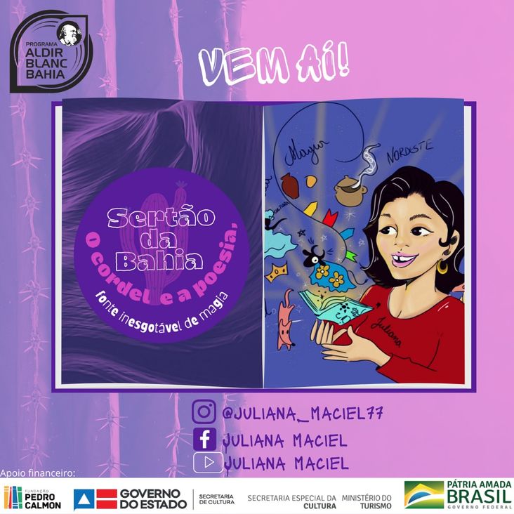 Sertão da Bahia - O cordel e a poesia, fonte inesgotável de magia é o projeto que reúne a maior publicação da poetisa, cordelista, repentista, contista, professora e multiplicadora da leitura Juliana Maciel. Em fevereiro e março a autora realizará a publicação e o lançamento da obra “Meus amores, minhas dores”, que reúne 30 poemas, em e-book, 3 videopoemas, mais uma série de 5 folhetos de cordéis digitais, exibidos em videocordéis, e também serão realizadas 2 lives com oficinas de poesia, um quiz de incentivo à leitura e a publicação da versão impressa do e-book.