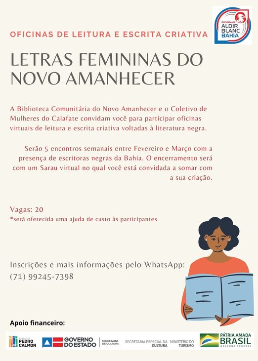 O projeto "Letras Femininas do Novo Amanhecer", promovido pela Biblioteca Comunitária do Novo Amanhecer em parceria com o Coletivo de Mulheres do Calafate, tem como objetivo aproximar mulheres da comunidade do Calafate através da literatura e da escrita por meio de um ciclo de rodas de leitura virtuais.