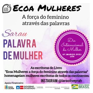 O evento “Sarau Palavra de Mulher” que será realizado no dia 07 de março é uma proposta das escritoras do Projeto do Livro "Ecoa Mulheres: a força do feminino através das palavras" que tem como objetivo celebrar o Dia Internacional da Mulher e homenagear mulheres escritoras que inspiram.