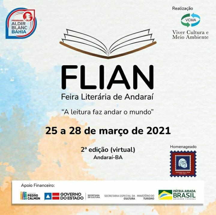 “A leitura faz andar o mundo”. Esse é o tema da segunda edição da FLIAN - Feira Literária de Andaraí. O evento que ocorre em Andaraí, cidade localizada na Chapada Diamantina, acontece no formato virtual e será realizada de 25 a 28 de março. Terá como homenageado, o educador Paulo Freire, que em setembro deste ano, completaria 100 anos. A programação será constituída de mesas temáticas, lançamentos de livros, oficinas, apresentações artísticas, entre outras atividades.