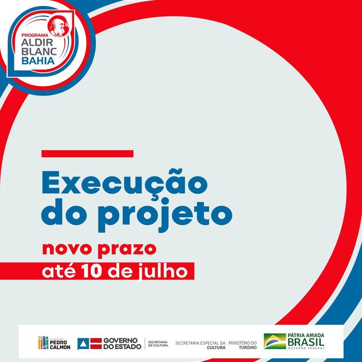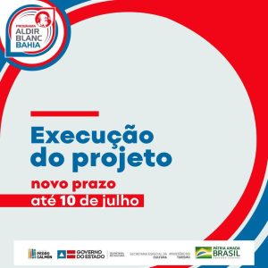 Cumprindo o Plano de Aplicação da Secretaria Especial de Cultura, do Ministério do Turismo (MTur) do governo Federal, a premiação faz parte do Programa Aldir Blanc Bahia, que tem execução do Governo do Estado, através da Secretaria de Cultura do Estado da Bahia. A apresentação do relatório simplificado de atividades pelos proponentes premiados fica adiada também para o dia 30 de julho de 2021.