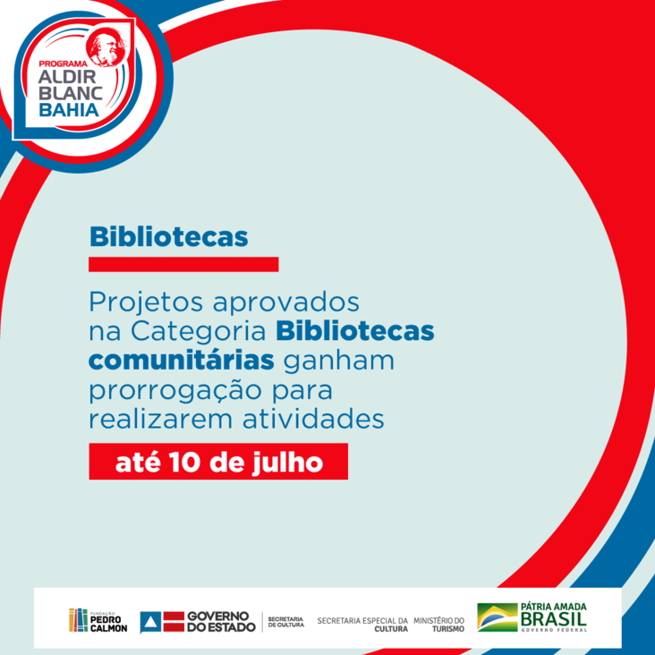 De acordo com publicação feita no dia 9 de abril no Diário Oficial do Estado, a Fundação Pedro Calmon (FPC/SecultBa) prorrogou o prazo de execução dos projetos contemplados do Edital 001/2020 até o dia 10 de julho de 2021.