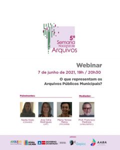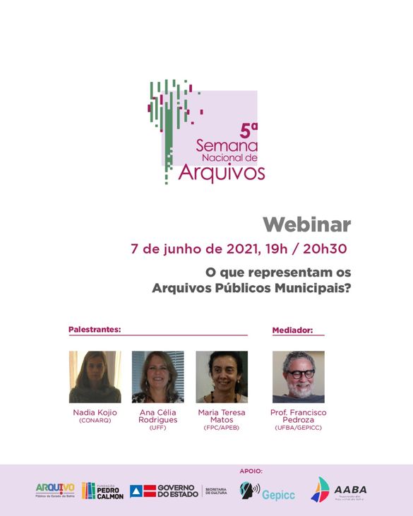De acordo com a programação do APEB/FPC, destaque para o Webinar “O que representam os Arquivos Públicos Municipais?” que será realizado na segunda-feira (7), das 19h00 às 20h30, no Youtube da FPC. A atividade visa promover um diálogo sobre o papel estratégico do Arquivo Público Municipal na administração pública e contará com a presença virtual de Ana Célia Rodrigues (UFF), Nádia Kojio (CONARQ/APMSJC) e Maria Teresa Matos (FPC/APEB), sob a mediação do Professor Francisco Pedroza (UFBA/GEPICC).