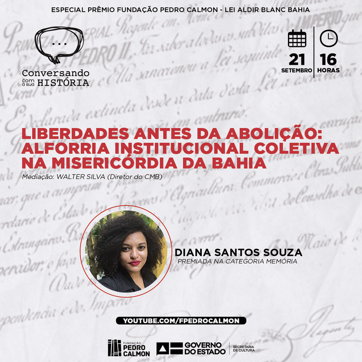 Com o título Liberdades antes da abolição: Alforria institucional coletiva na Misericórdia da Bahia, o Centro de Memória da Bahia, unidade da Fundação Pedro Calmon (FPC/SecultBa) realiza mais um encontro do Conversando com a sua História especial.