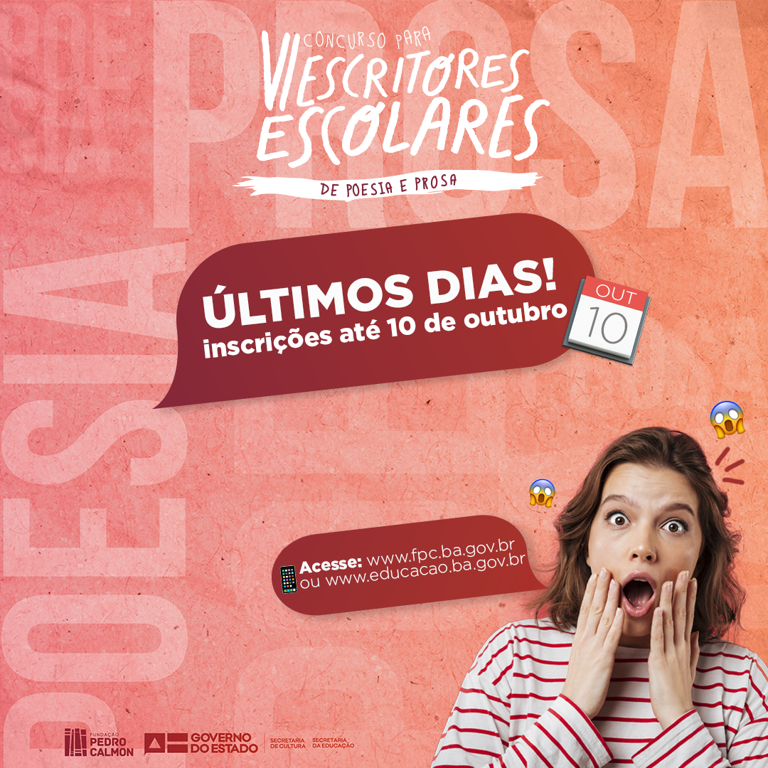 Inscrição - O prazo de inscrição encerra no dia 10 de outubro. Para quem é aluno da rede estadual de ensino, a inscrição pode ser feita na própria escola. Para os demais alunos, a inscrição pode ser feita através do formulário no site da Fundação Pedro Calmon e Secretaria de Educação (clique aqui). Cada estudante poderá se inscrever em apenas uma das categorias – poesia ou prosa – sendo temática livre e de escolha exclusiva do estudante e caso seja menor de 18 anos, a inscrição deve ser acompanhada da autorização dos responsáveis.Quaisquer dúvidas e esclarecimentos adicionais deverão ser enviados ao e-mail: concurso.escritores@fpc.ba.gov.br.