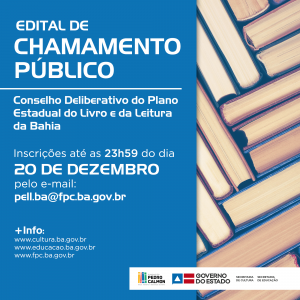 As Secretarias  de Cultura (SecultBa) e de Educação da Bahia (SEC) lançaram hoje (20) o edital de Chamamento Público Conjunto nº001/2021, visando a composição do Conselho Deliberativo do Plano Estadual do Livro e da Leitura da Bahia (CDPELL/BA) para o Biênio 2021-2023. O Edital está aberto até dia 20 de dezembro e é coordenado pela Fundação Pedro Calmon (FPC/SecultBA).