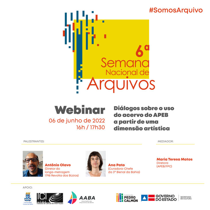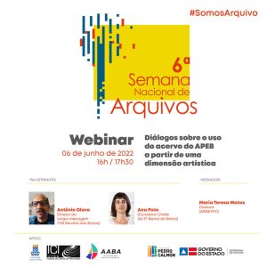 Durante a semana, o APEB realiza o webnário “Diálogos sobre o uso do acervo do APEB a partir de uma dimensão artística” que acontecerá no dia 06 de junho, às 16h e tem como objetivo promover um diálogo sobre o significado e a importância de experiências realizadas a partir do uso do acervo documental custodiado pelo APEB como um lugar de memória histórica e fonte de pesquisa singular.