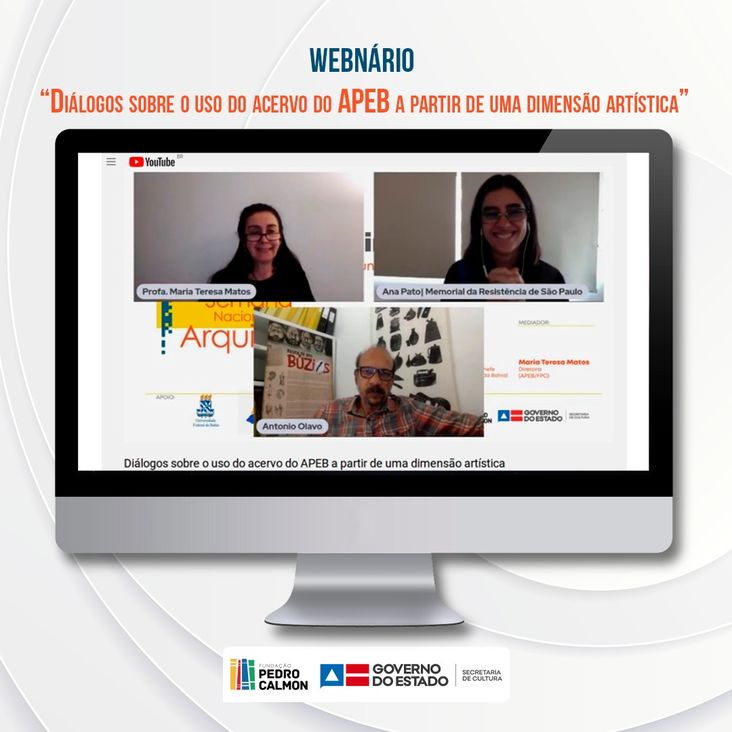 Na última segunda-feira (06), o Arquivo Público do Estado da Bahia (APEB), gerenciado pela Fundação Pedro Calmon (FPC/SecultBa), participou do webnário “Diálogos sobre o uso do acervo do APEB a partir de uma dimensão artística”, organizado pelo Arquivo Nacional. O evento online teve como objetivo ressaltar a importância do acervo documental custodiado pela instituição como um lugar de memória histórica e fonte de pesquisa singular.