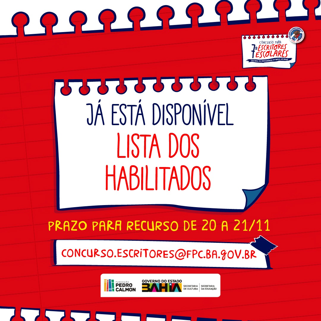 As listas com os nomes dos estudantes, professores e escolas habilitadas e inabilitadas podem ser consultadas no site da FPC – www.fpc.ba.gov.br . Aos interessados em entrar com recurso por conta da inabilitação, o prazo estende-se pelos dois dias úteis subsequentes (20 e 21 de novembro de 2023) a publicação deste resultado preliminar. Os recursos e quaisquer dúvidas devem ser enviados ao e-mail concurso.escritores@fpc.ba.gov.br