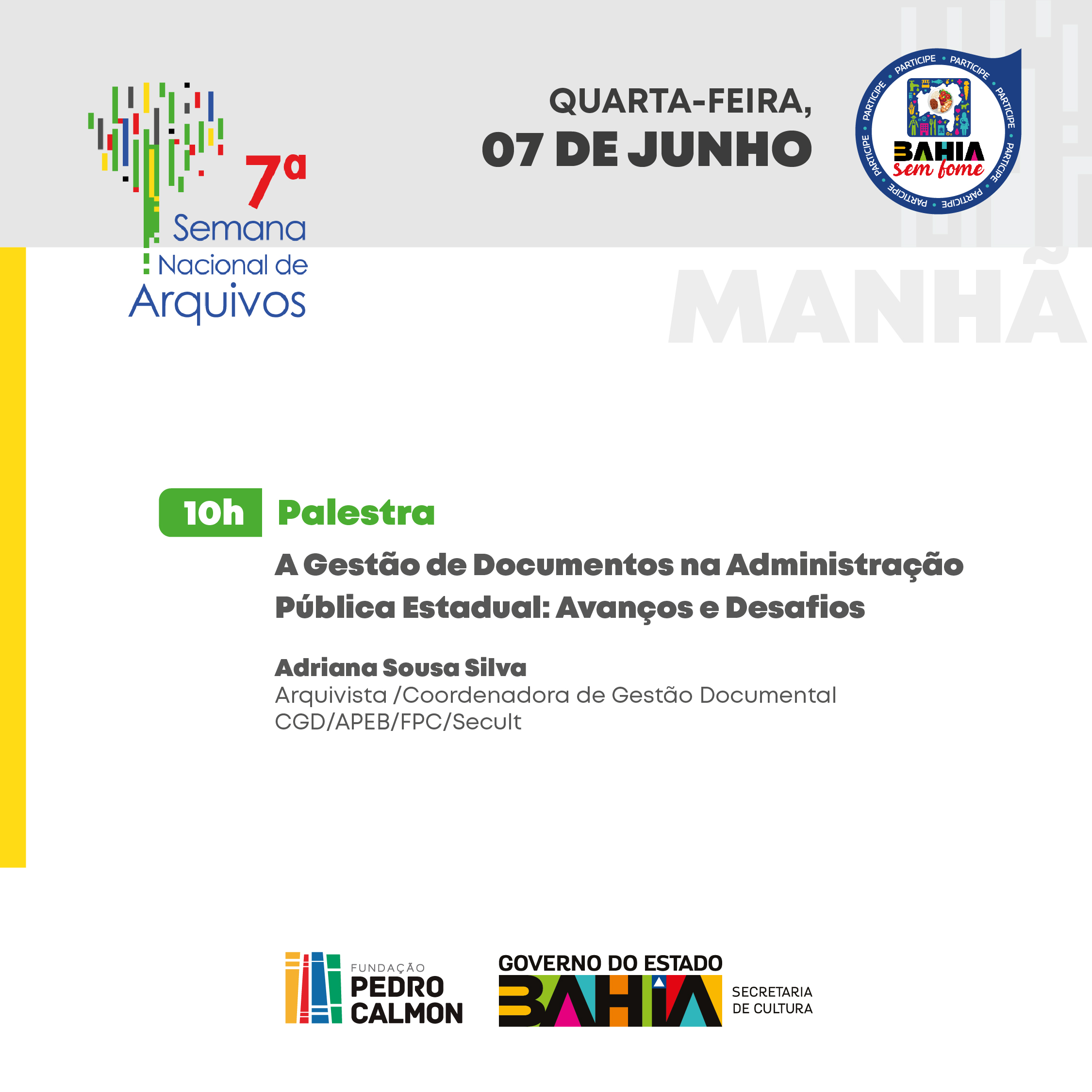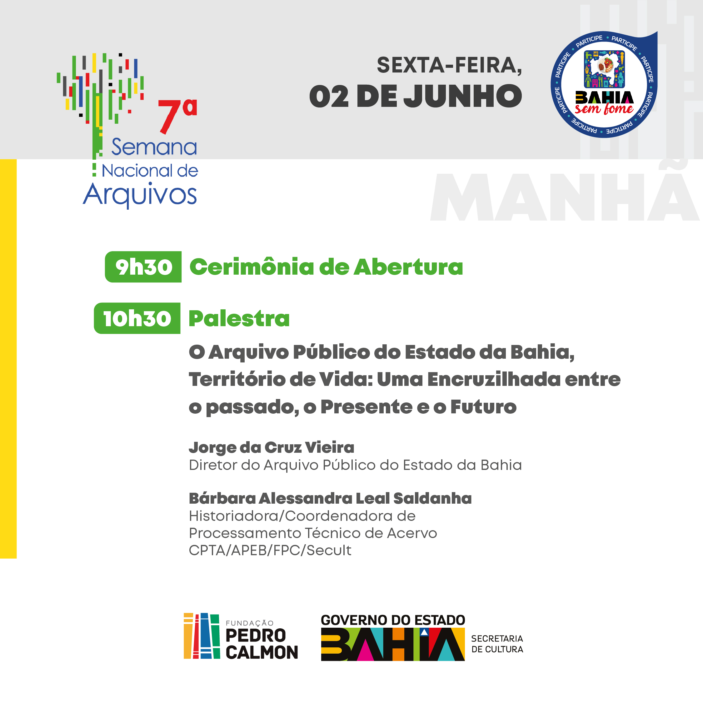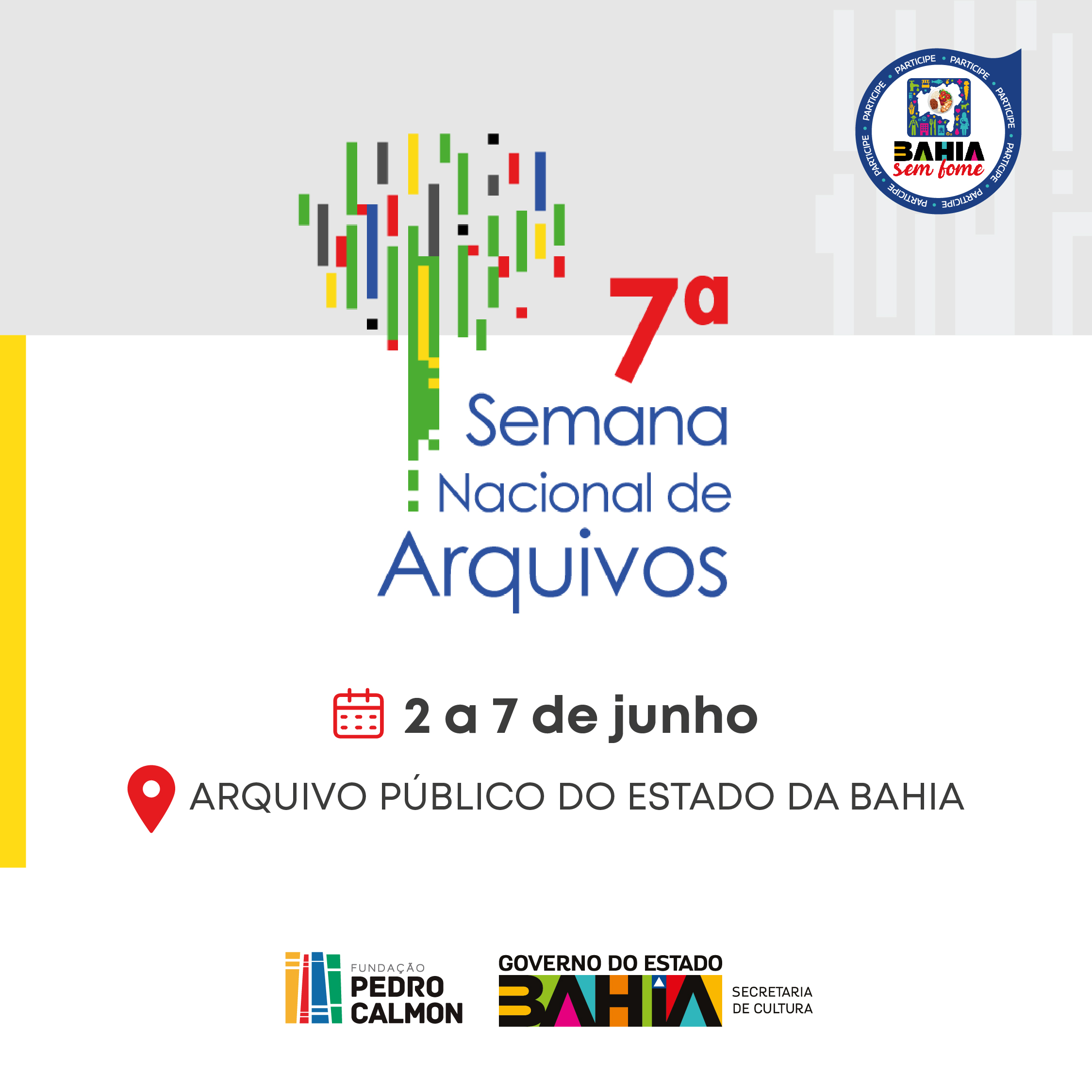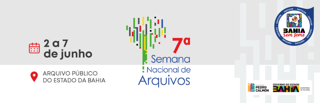 Para a 7ª Semana de Arquivos, a FPC sugere ao público que doe alimentos para o Bahia Sem Fome, programa de Combate à Fome do Governo do Estado da Bahia que tem como principal meta promover a segurança alimentar e nutricional no Estado. O APEB é um dos pontos de arrecadação da campanha.