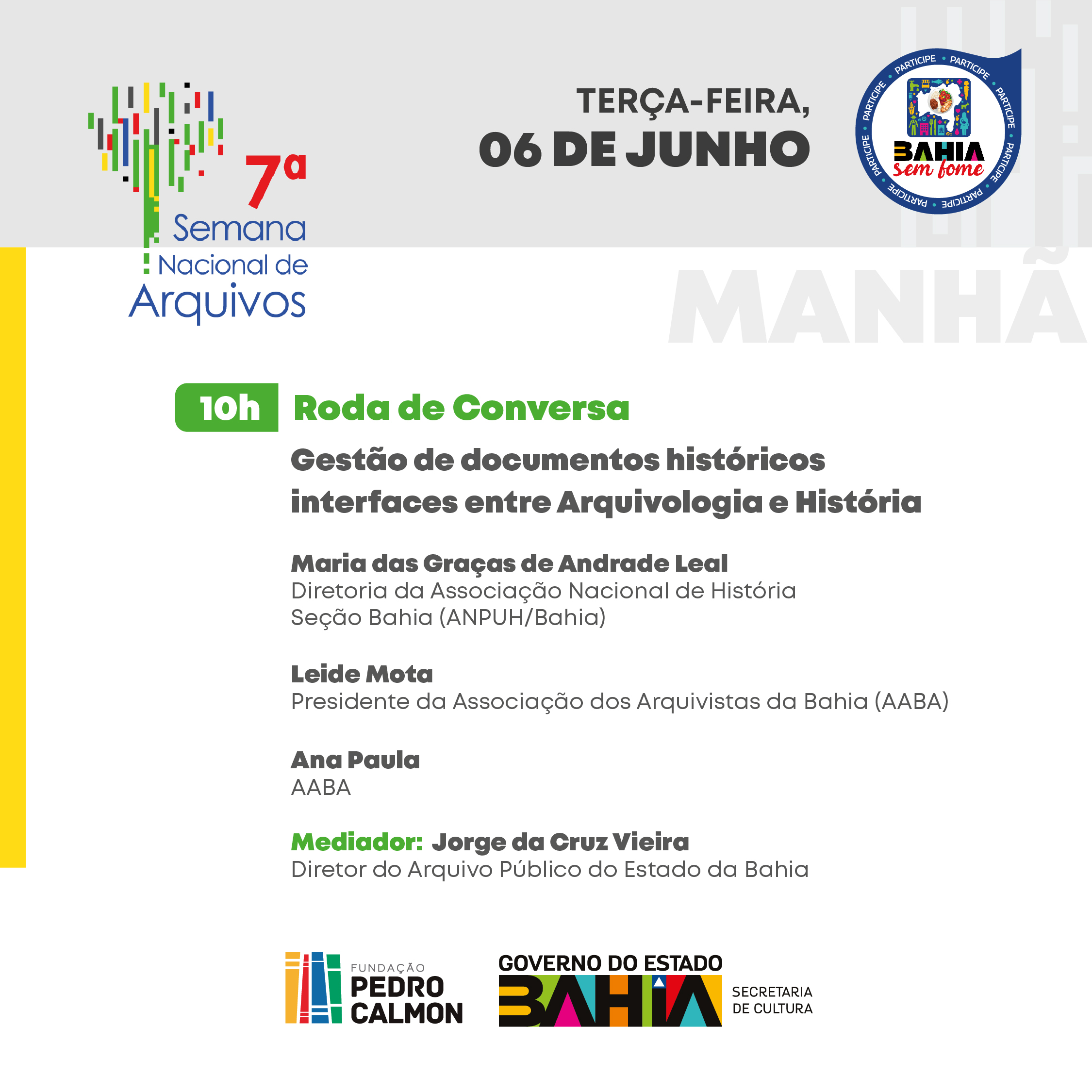 No dia 6, às 10h, a roda de conversa “gestão de documentos históricos - interfaces entre Arquivologia e História” reúne Maria das Graças de Andrade Leal, da Diretoria da Associação Nacional de História (ANPUH/Ba), Leide Mota, presidente da Associação dos Arquivistas da Bahia (AABA) e Ana Paula Ramos, arquivista associada à AABA.