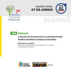 Finalizando a programação, no dia 7, às 10h, Adriana Silva, arquivista e coordenadora de gestão documental, do APEB, realiza a palestra “A Gestão de Documentos na Administração Pública Estadual: Avanços e Desafios”.