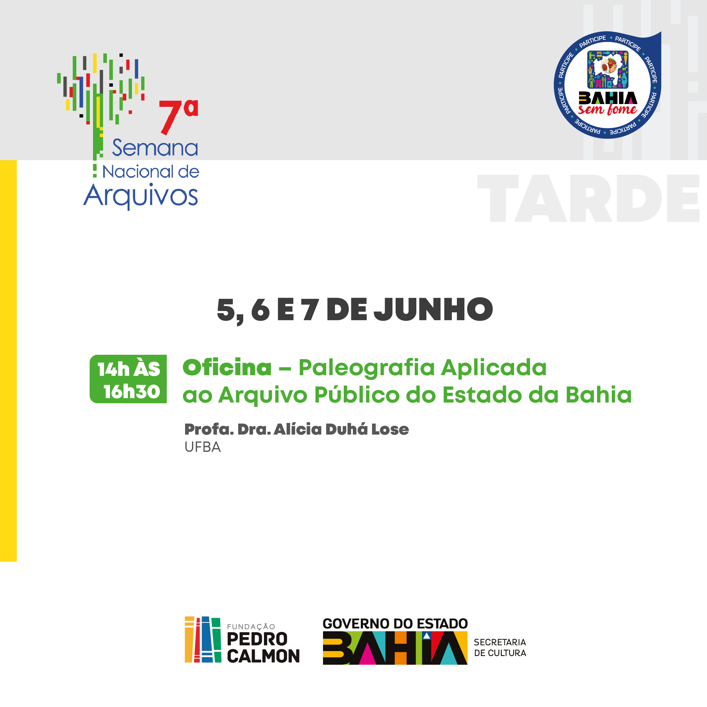 Do dia 5 a 7 de junho acontece a oficina “Paleografia aplicada ao Arquivo Público do Estado da Bahia”, ministrada Alícia Duhá Lose, doutora em Letras pela UFBA, que desenvolveu um um método para análise do acervo de documentos dos manuscritos da unidade. Os encontros acontecem das 14h às 16h30, e os interessados devem se inscrever através de formulário. (Clica Aqui)