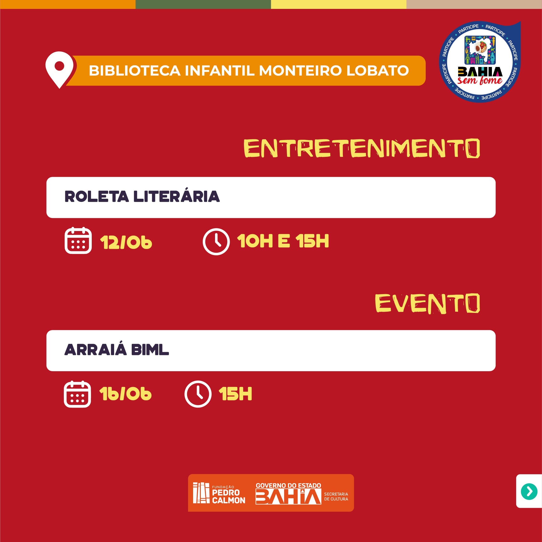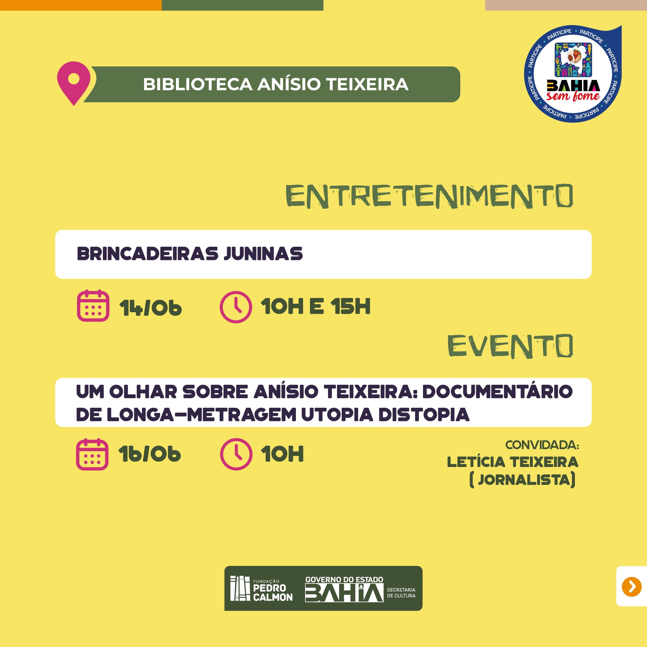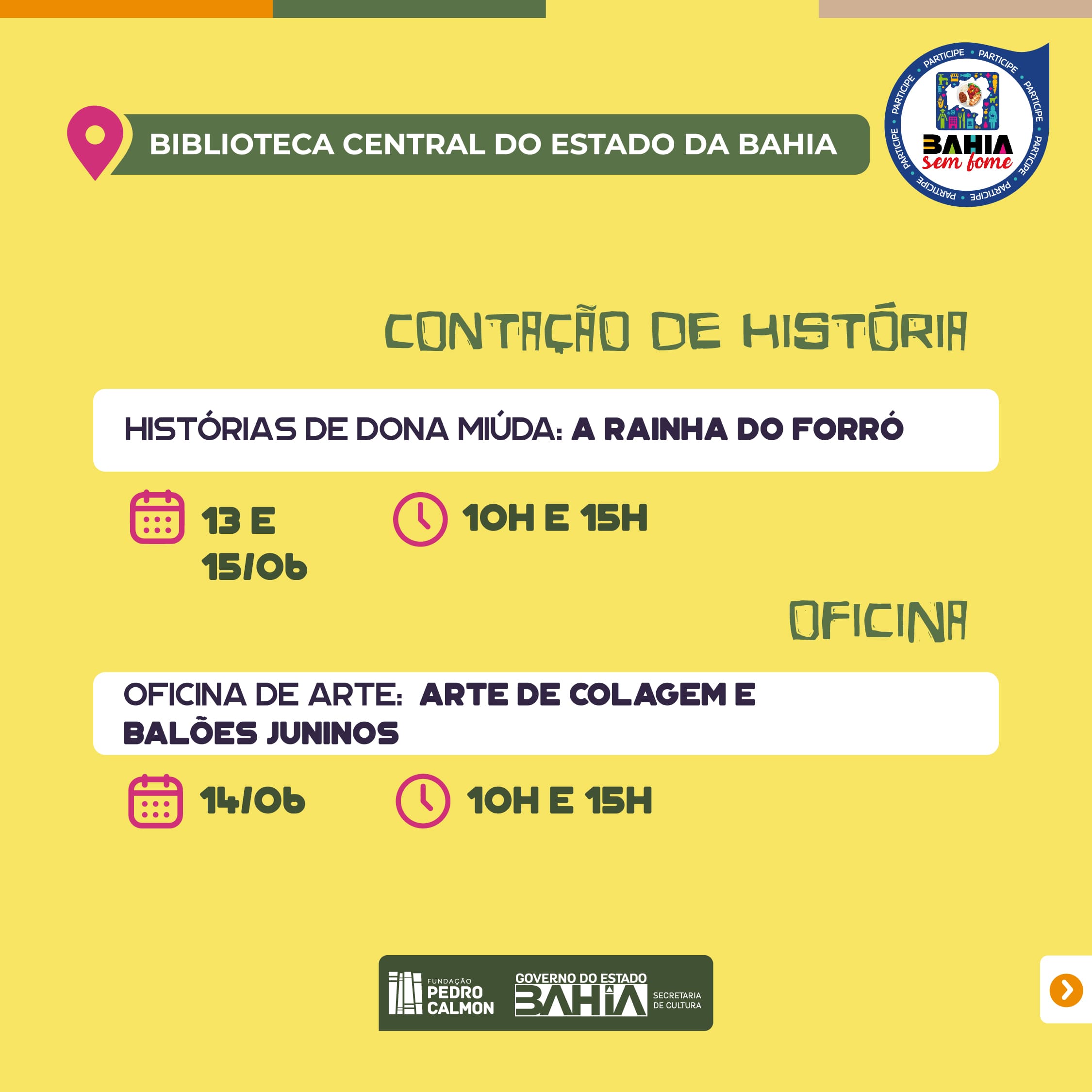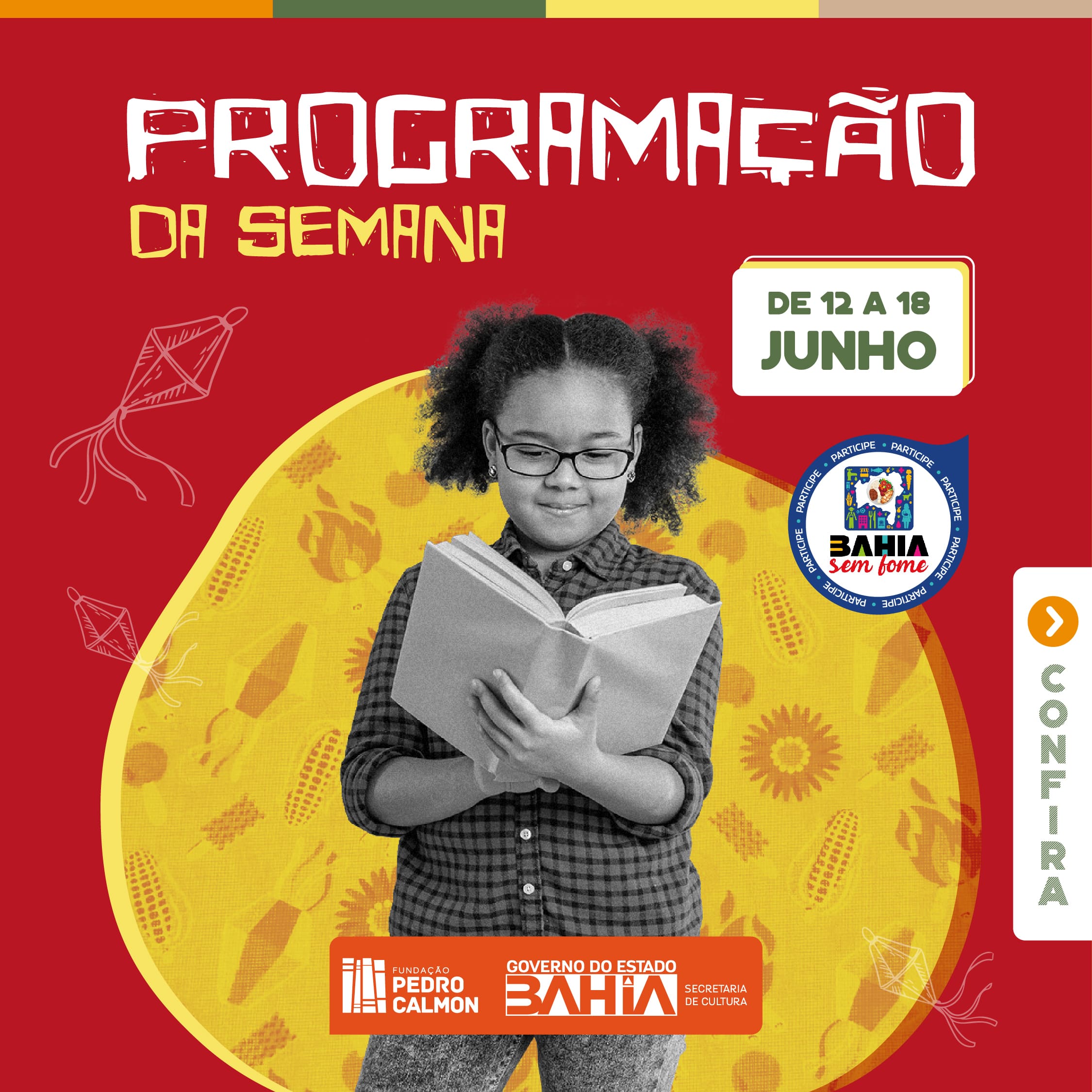 Participe das celebrações dos Festejos Juninos que o Sistema Estadual de Bibliotecas Públicas (SEBP), gerido pela Fundação Pedro Calmon, tem realizado ao longo de todo mês. Veja mais da programação da semana de 12 a 18 de junho.