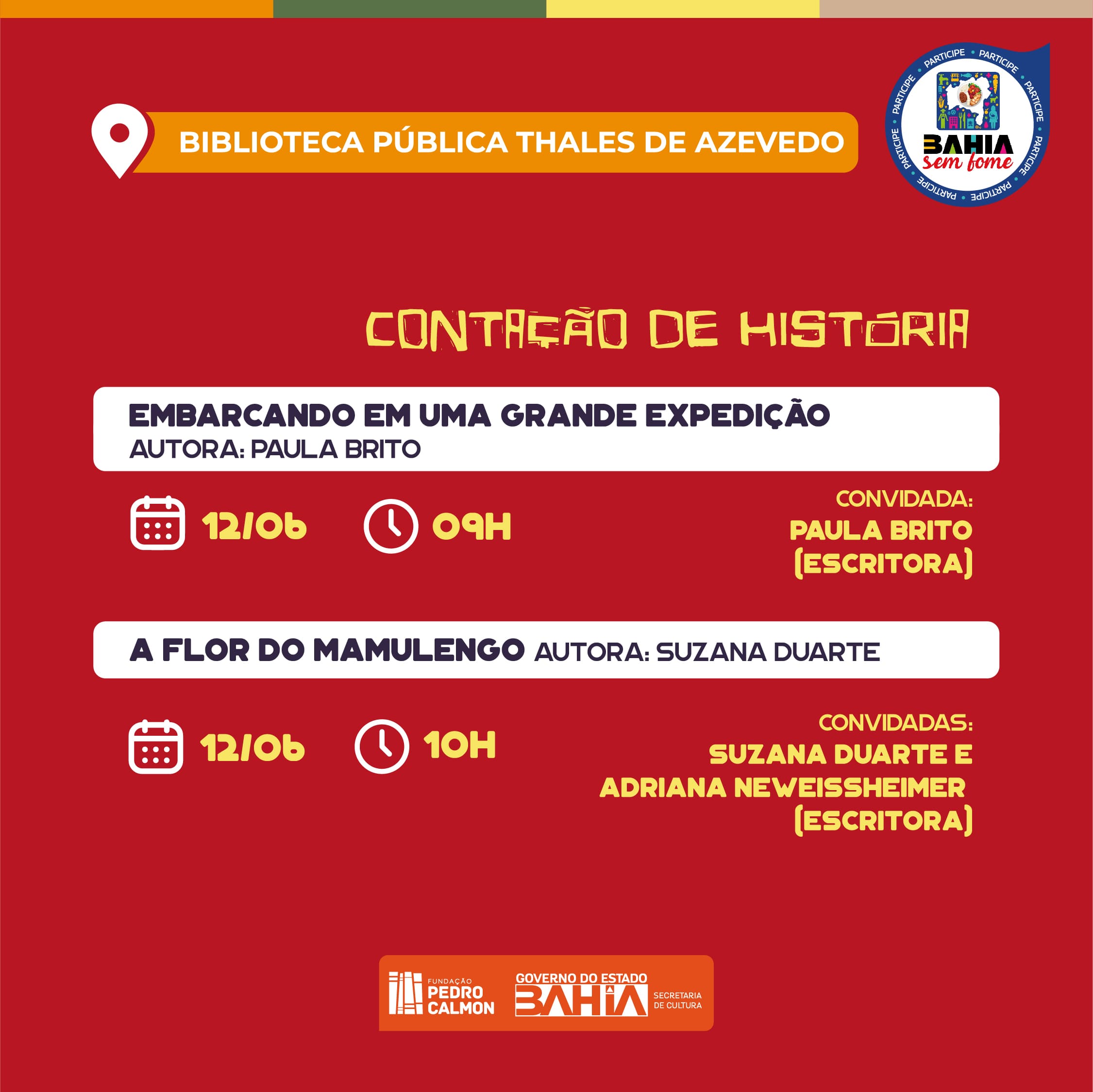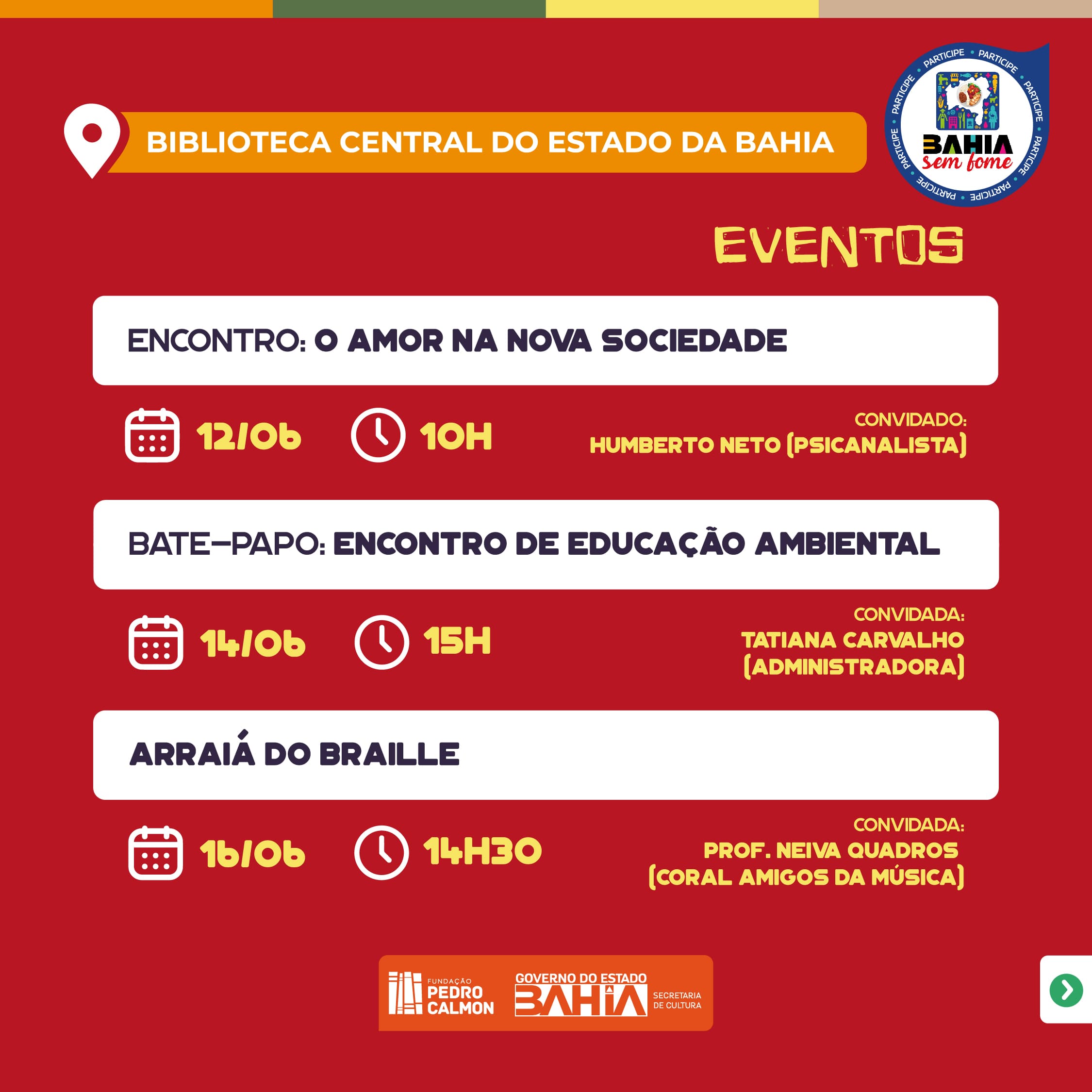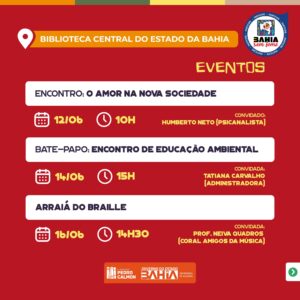 Também na segunda (12), no quadrilátero da Biblioteca Central do Estado da Bahia (BCEB), às 10h, acontece uma roda de conversa com o psicanalista Humberto Neto para uma reflexão que debate “O amor na Nova Sociedade: Desafios, Acordos, Dinâmicos e Entraves”.