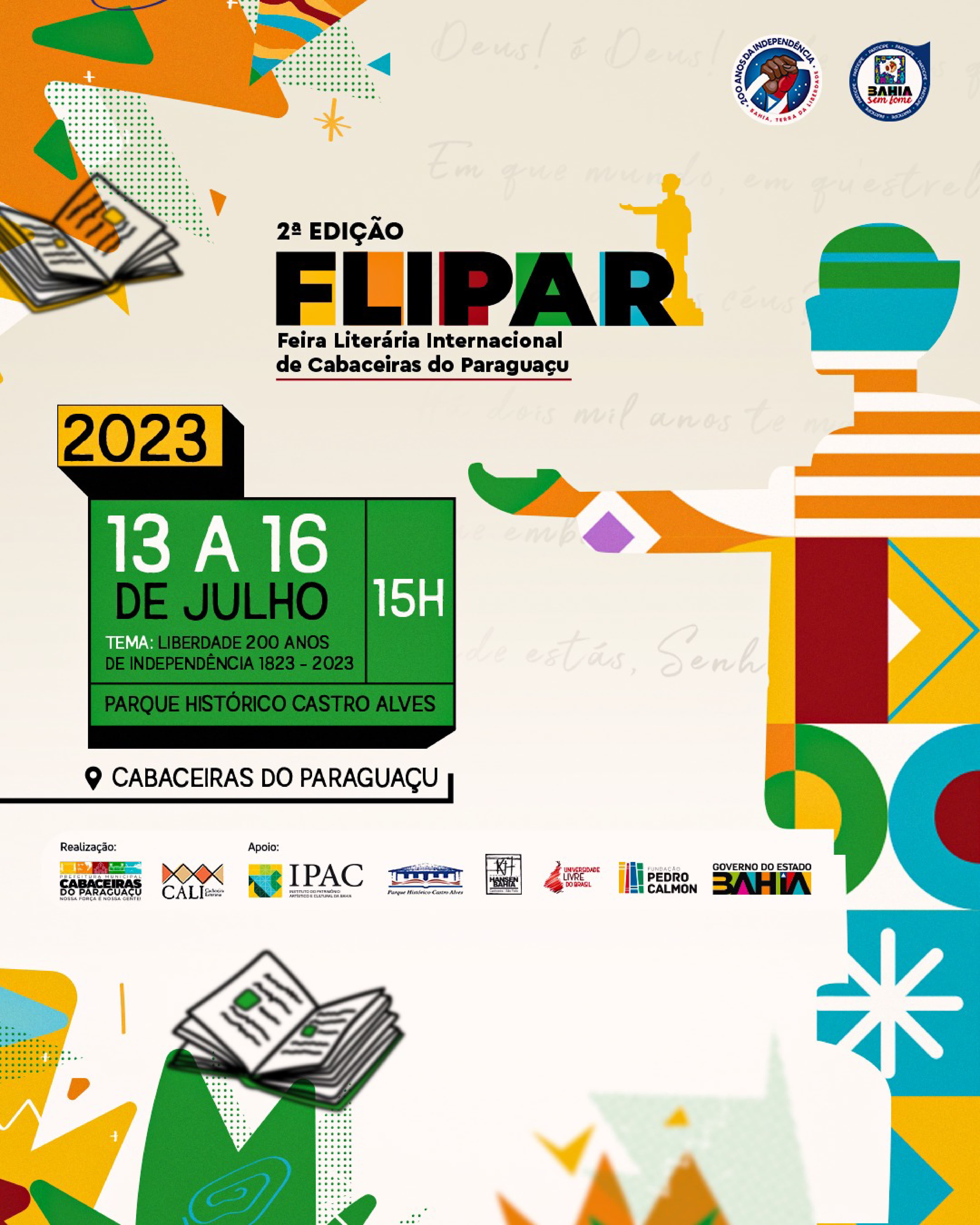 O Bicentenário da Independência do Brasil na Bahia é o destaque da segunda edição da Feira Literária Internacional de Cabaceiras do Paraguaçu – Flipar. A feira que tem o apoio da Fundação Pedro Calmon (FPC/SecultBa), acontece no Parque Histórico Castro Alves, nos dias 13 a 16 de julho, no Recôncavo Baiano. Este ano, terá como tema Liberdade 200 anos de Independência 1823 - 2023.
