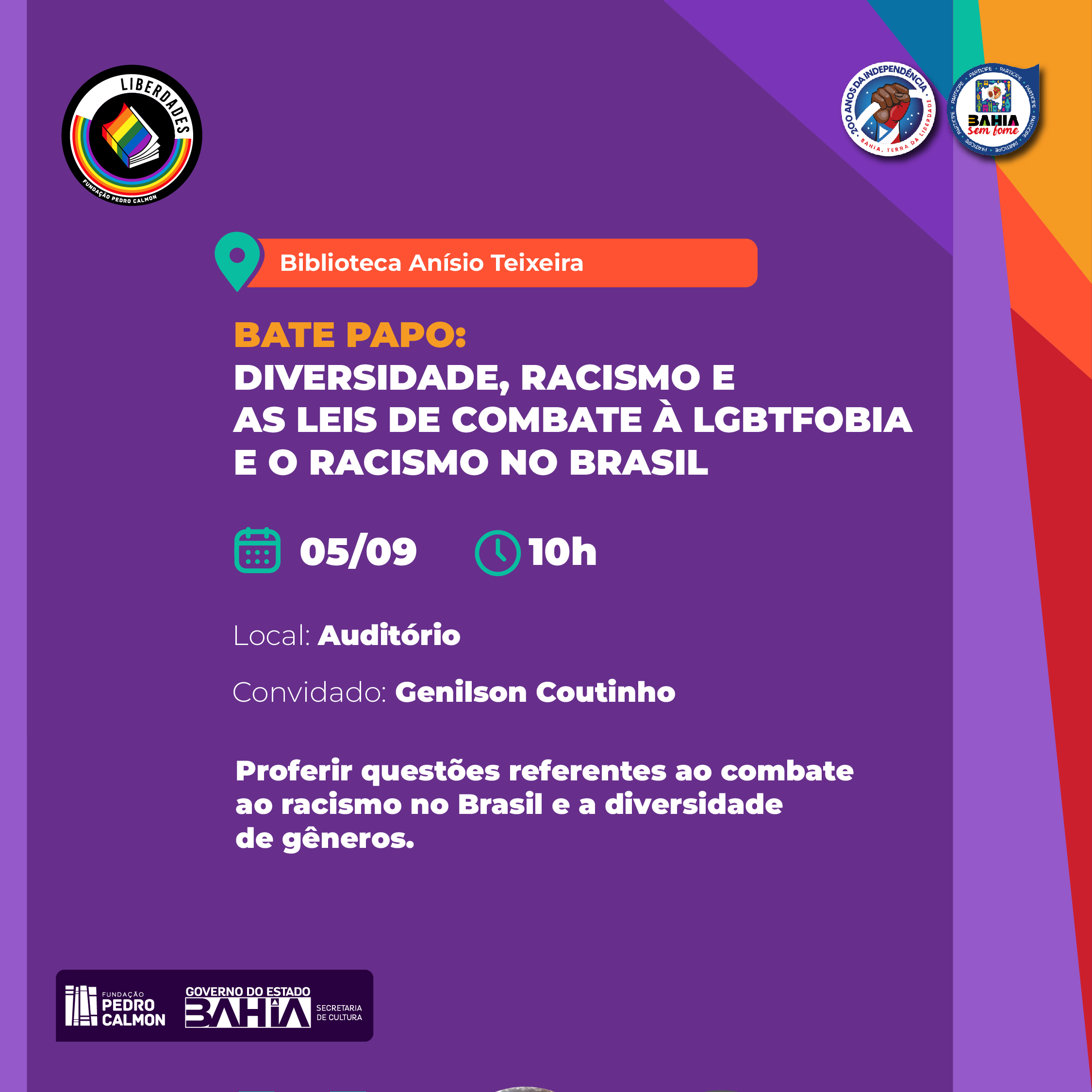 Já na Biblioteca Anísio Teixeira, a conversa será sobre “Diversidade, Racismo e as leis de combate a LGBTFobia e o racismo no Brasil”, na terça-feira (05/09), às 10h, com o convidado Genilson Coutinho. Ainda na quinta (05/09), na Biblioteca Juracy Magalhães Jr, em Itaparica, a partir das 14h, o debate será sobre a temática “Se reconhecer como uma pessoa LGBTQIAPN+ e se abraçar”, com a Dra. Luciana Mariano, em parceria com a ONG Ilha das Crianças, através do Projeto Maria.