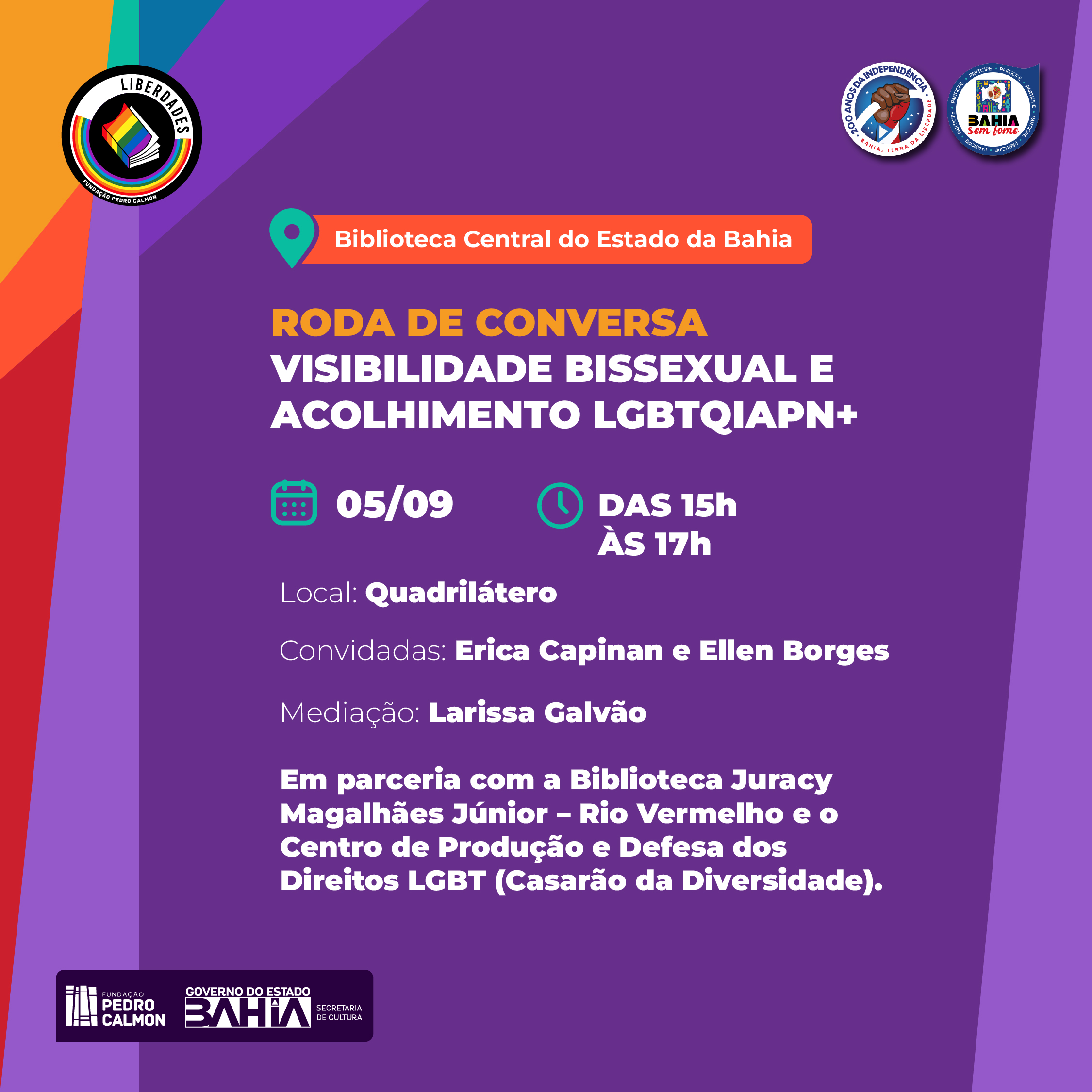Na Biblioteca Central do Estado da Bahia, localizada no bairro Barris, em Salvador, na próxima terça-feira (05/09), a partir das 15h, será promovida em parceria com a Biblioteca Juracy Magalhães Jr. – Rio Vermelho e o Centro de Promoção dos Direitos LGBT (Casarão da Diversidade), a Roda de Conversa sobre “Visibilidade Bissexual e Acolhimento LGBTQIAPN+”, com as convidadas Erica Capinan, Pedagoga, Diretora do Departamento LGBT na Prefeitura de Lauro de Freitas), e com Ellen Borges, Integrante de coletivo LGBTQIAPN+ em Camaçari.