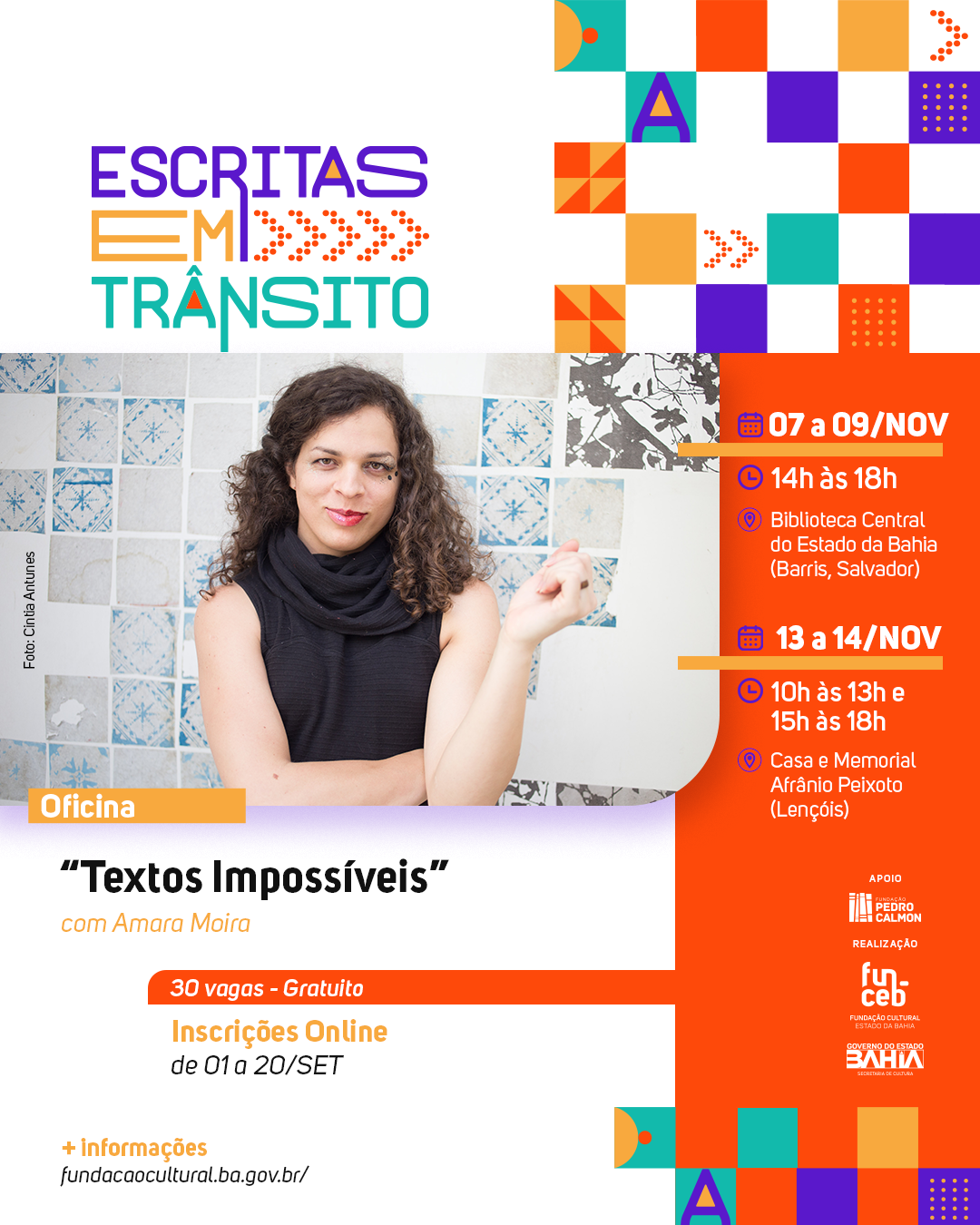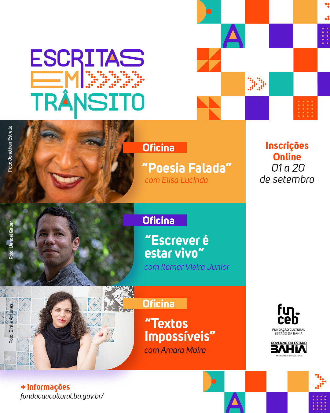 Atenção artistas da palavra de toda a Bahia! A Fundação Cultural do Estado da Bahia abre inscrição para o projeto Escritas em Trânsito, que busca estimular e qualificar a produção literária de artistas da palavra residentes na Bahia, através de oficinas de escrita literária com renomados (as) autores (as) do Brasil. Nesta edição, terá a participação de Elisa Lucinda, Amara Moira e Itamar Vieira Junior. As inscrições online estão abertas de 1º a 20 de setembro de 2023. O Escritas em Trânsito é realizado pela Coordenação de Literatura da Diretoria das Artes da Funceb desde 2012 e, até então, 31 oficinas já foram realizadas. Podem participar artistas da palavra, pesquisadores, estudantes e pessoas interessadas em Literatura, a partir de 18 anos. Esta é a primeira vez que o projeto vai realizar oficinas fora de Salvador.