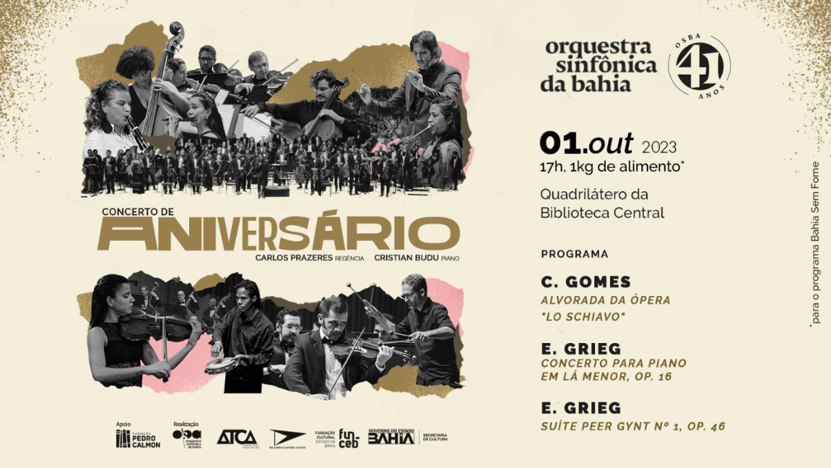 A Orquestra Sinfônica da Bahia inicia o mês de outubro com o concerto de comemoração dos 41 anos da Orquestra, que será realizado neste domingo (dia 1º de outubro), às 17h, no Quadrilátero da Biblioteca Central do Estado da Bahia. A apresentação conta com a regência do maestro Carlos Prazeres e solo do pianista paulista Cristian Budu. A entrada será feita por meio da doação de 1kg de alimento não perecível, que será destinado ao programa Bahia Sem Fome, programa de Combate à Fome do Governo da Bahia e que tem como meta promover a segurança alimentar e nutricional no Estado. A apresentação conta com o apoio da Fundação Pedro Calmon, unidade da Secretaria de Cultura do Estado da Bahia (SecultBA) que administra a Biblioteca Central.