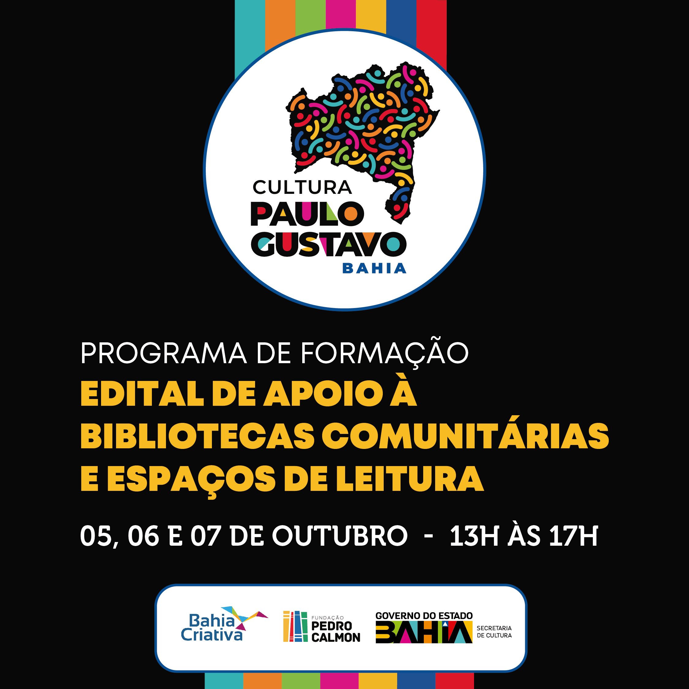 Nos dias 05, 06 e 07 de outubro a Secretaria de Cultura, por meio da Fundação Pedro Calmon e pela gerência do Sistema Estadual de Bibliotecas Públicas da Bahia – SEBP realizará oficinas de elaboração de projetos voltados para o edital de Apoio a Bibliotecas Comunitárias e Espaços de Leitura. As atividades vão acontecer de forma presencial no auditório da Biblioteca Anísio Teixeira (BAT) nos dias 05 e 06, para Salvador e RMS, e virtual no dia 07 de outubro, para todas as pessoas.