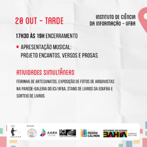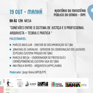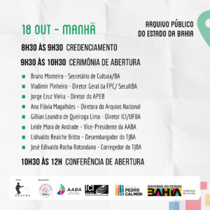 Confira a programação do evento que será realizado dia 18/10 no Arquivo Público do Estado da Bahia, dia 19/10 no Auditório do Tribunal de Justiça da Bahia – TJBA e no dia 20/10 no ICI – Instituto de Ciência da Informação – UFBA.