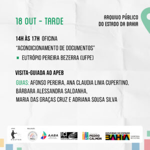 O evento é uma realização da Secretaria de Cultura do Estado da Bahia, por meio da Fundação Pedro Calmon e pelo Arquivo Público do Estado da Bahia, em parceria com o Instituto de Ciência da informação da ICI/UFBA e a Associação dos Arquivistas da Bahia – AABA.