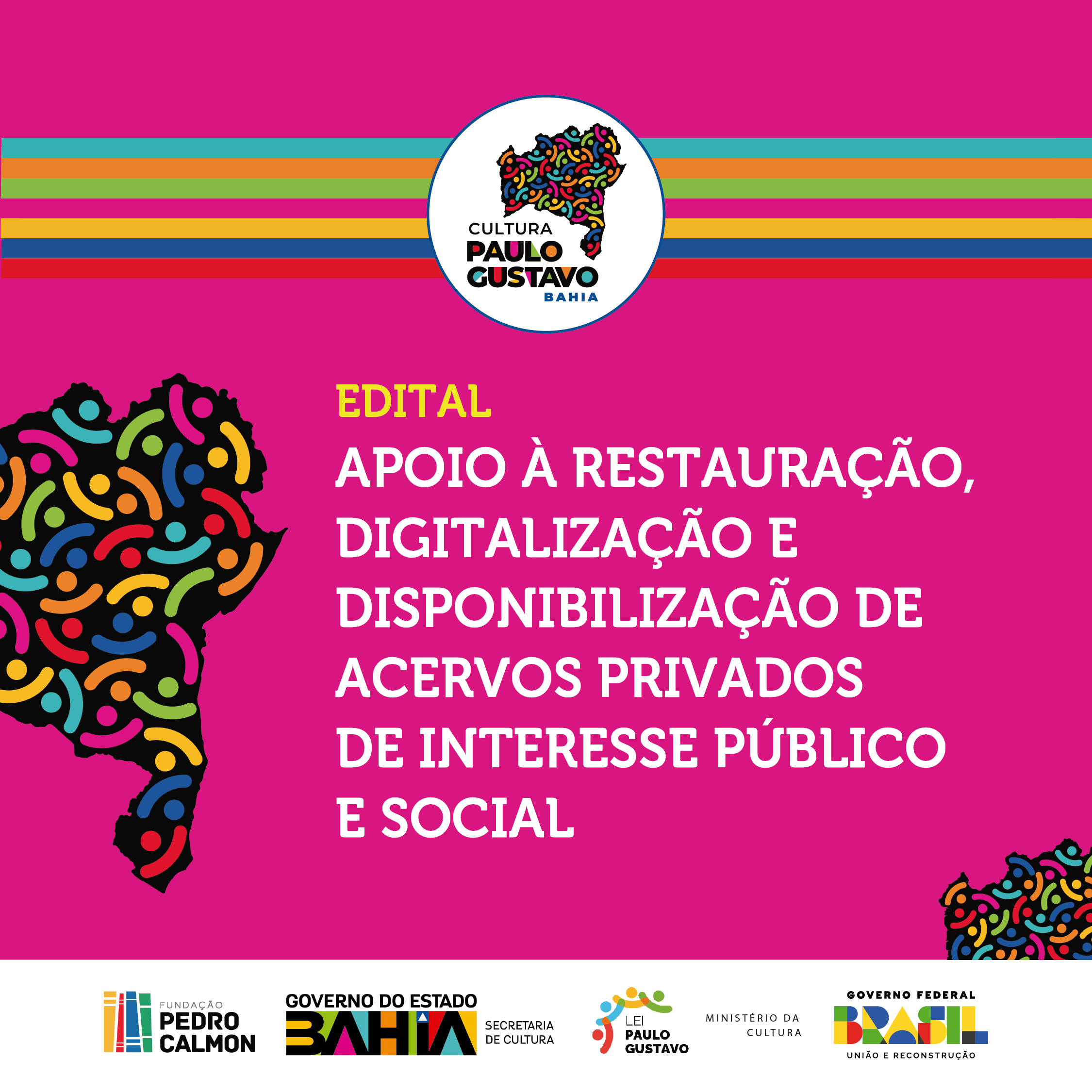 PAULO GUSTAVO BAHIA – A Lei Paulo Gustavo (LPG) foi criada como lei emergencial para mitigar os impactos da pandemia da COVID-19 junto aos agentes de cultura. A LPG foi regulamentada em um grande ato na Concha Acústica do Teatro Castro Alves em Salvador com participação do presidente Lula e da ministra da Cultura Margareth Menezes, em maio de 2023. A Bahia foi o primeiro estado a apresentar e aprovar o plano de ação junto ao Ministério da Cultura (MinC) e fez uma série de escutas populares, além de cursos de formação, nos 27 territórios de identidade para criar os editais e contemplar as demandas das fazedoras e fazedores da cultura baiana.