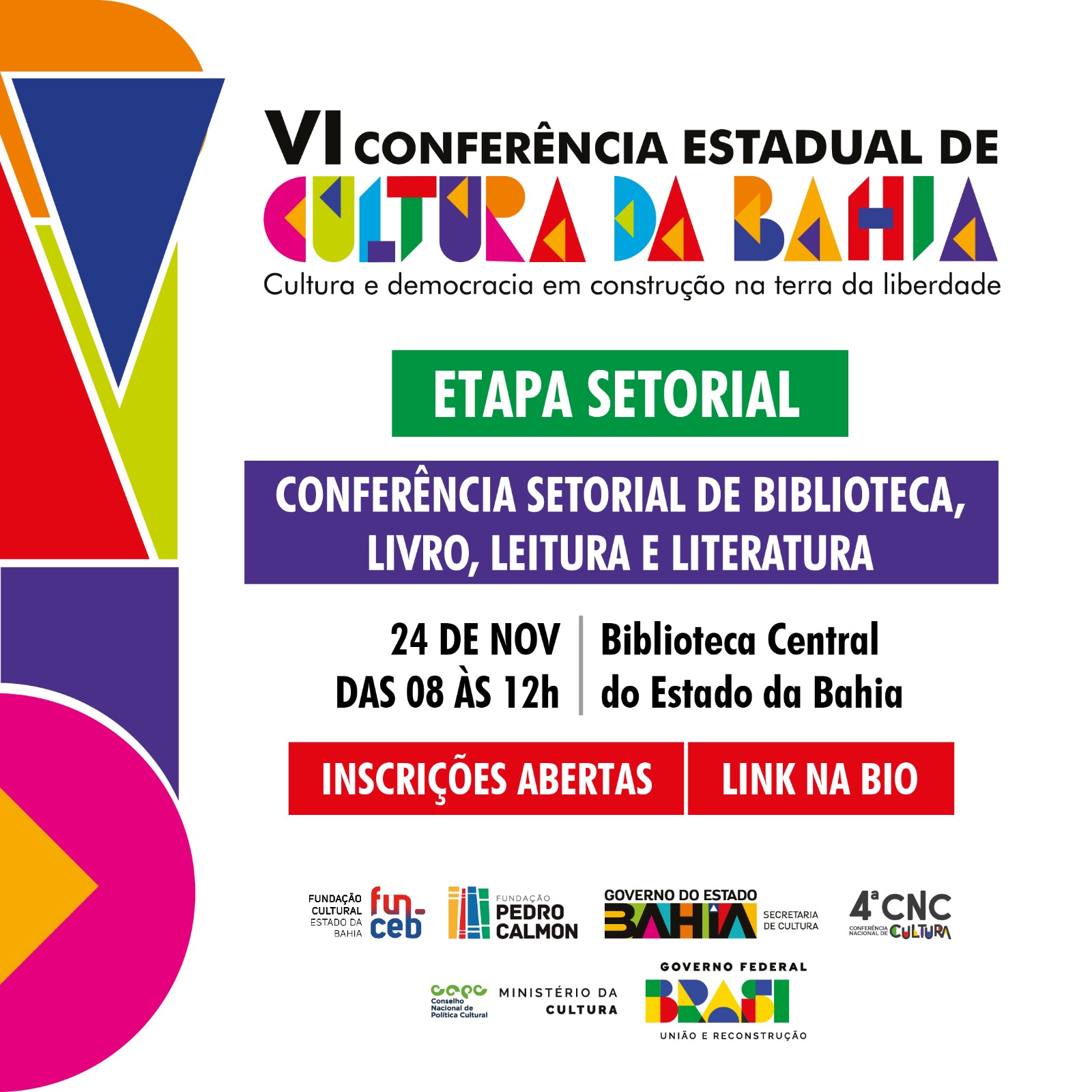 A Secretaria de Cultura da Bahia (SecultBA), por meio da Fundação Pedro Calmon (FPC) e em parceria com a Fundação Cultural do Estado da Bahia (Funceb) realiza a Conferência Setorial de Biblioteca, Livro, Leitura e Literatura, no dia 24 de novembro, das 08h às 12h, na Biblioteca Central do Estado, em Salvador. Os interessados em participar das setoriais de Biblioteca, Livro, Leitura devem se inscrever através do link. Já para Literatura as inscrições serão por este link entre os dias 16 a 22/11.através do link.
