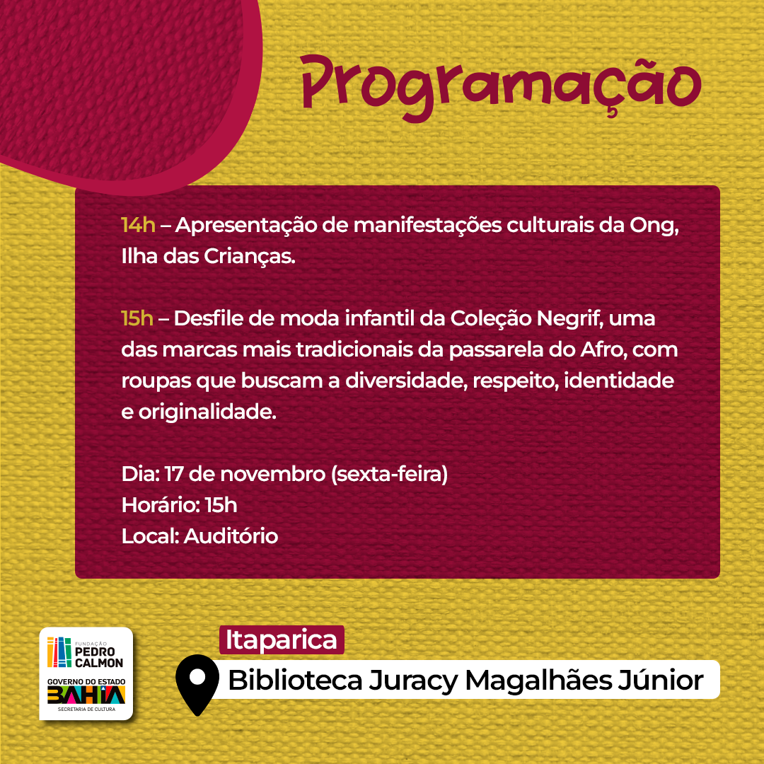 O evento acontece no auditório da Biblioteca Juracy Magalhães Júnior, a partir das 14h, com a realização da apresentação de manifestações culturais da ONG Ilha das Crianças. A programação conta também com um desfile de moda infantil da coleção Negrif, uma das marcas mais tradicionais da cultura-afrobaiana, com roupas que buscam a diversidade, o respeito, a identidade e a originalidade, colocando a criança como protagonista.