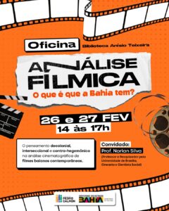 Nos dias 26 e 27 de fevereiro, a Biblioteca Anísio Teixeira (BAT), unidade da Fundação Pedro Calmon (FPC/SecultBA), realiza a Oficina de Análise Fílmica: O que é que a Bahia tem? - O pensamento decolonial, interseccional e contra-hegemônico na análise cinematográfica de filmes baianos contemporâneos. A atividade acontece das 14h às 17h.