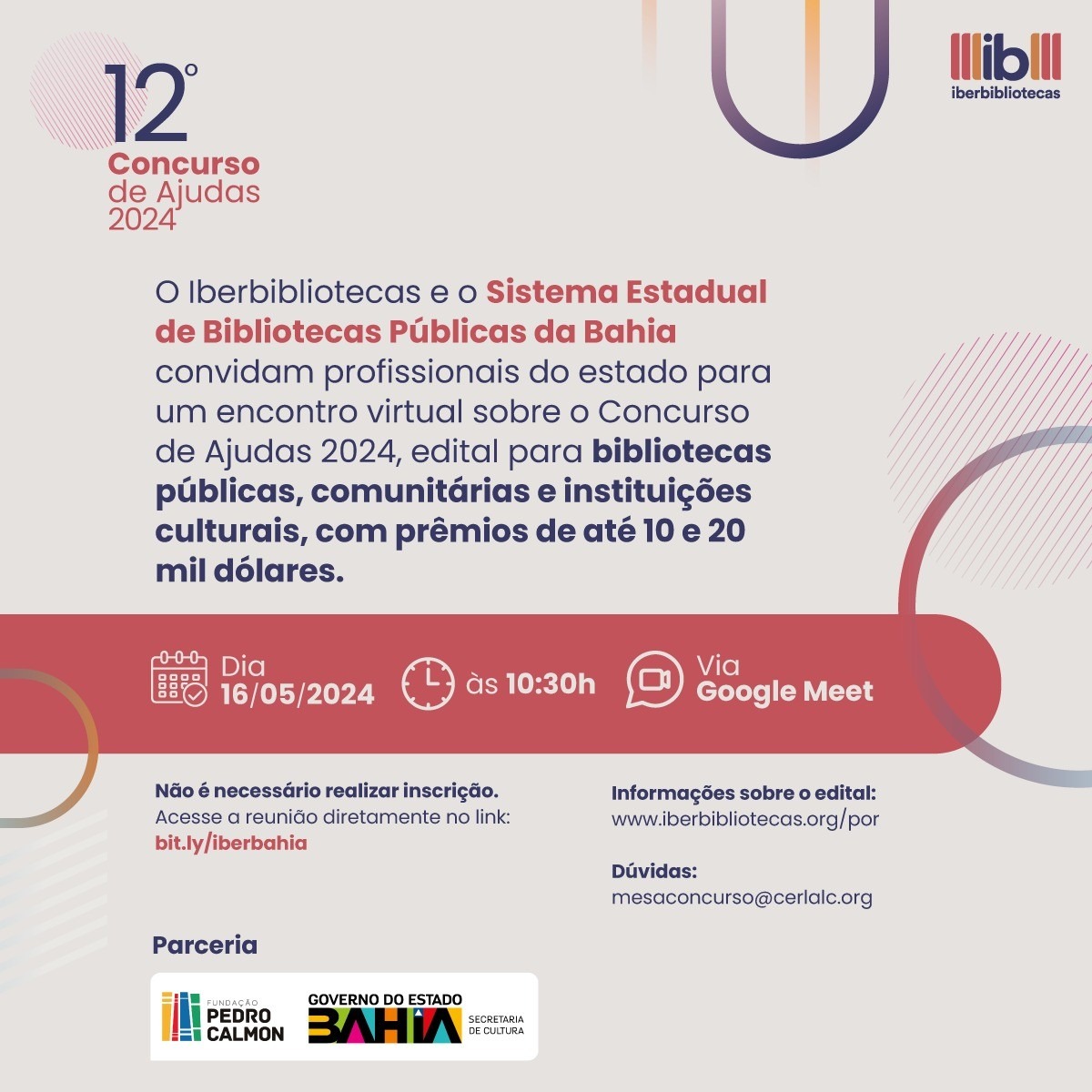O evento é gratuito e não requer inscrição prévia. Os interessados podem acessar a reunião diretamente através do link http://meet.google.com/zgw-sopu-aej O Concurso de Ajudas do Iberbibliotecas está com inscrições abertas para projetos novos ou em andamento até o dia 30 de junho de 2024. O concurso aceita propostas de todas as instituições, públicas ou privadas, desde que as ações sejam desenvolvidas em bibliotecas públicas ou comunitárias. Os participantes podem contar com assessoria especializada e gratuita para o desenvolvimento de suas ideias e projetos, bem como suporte na elaboração dos documentos de inscrição.