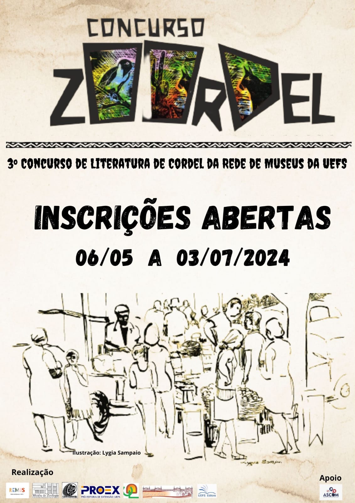 Estão abertas as inscrições da 3ª Edição do Concurso de Literatura de Cordel Zoordel com a temática: Feiras Livres. O certame é uma realização da Rede de Museus da UEFS  através da parceria entre os Museus de Zoologia, Casa do Sertão, o Programa de Pós-Graduação em Estudos Literários - PROGEL, a Pró-Reitoria de Extensão - PROEX e a UEFS Editora, com apoio institucional da Assessoria de Comunicação/ASCOM-UEFS.