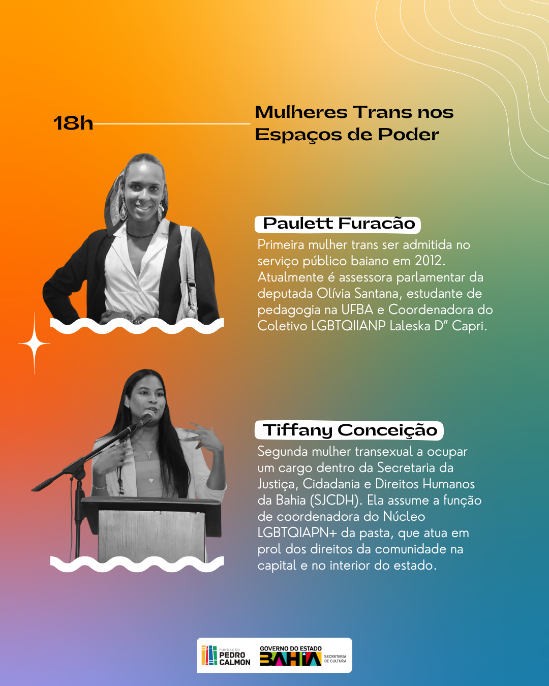 A programação conta com a mesa temática, “Mulheres Trans nos Espaços de Poder”, com a participação de Paulett Furacão, primeira mulher trans a ser admitida no serviço público baiano em 2012, assessora parlamentar da deputada Olívia Santana, estudante de pedagogia na UFBA e coordenadora do Coletivo LGBTQIIANP Laleska D” Capri, e de Thiffany Odara, pedagoga, ativista, Ialorixá, doutoranda em Educação, escritora e primeira mulher trans a lançar candidatura para o cargo de Ouvidora da Defensoria Pública do Estado da Bahia.